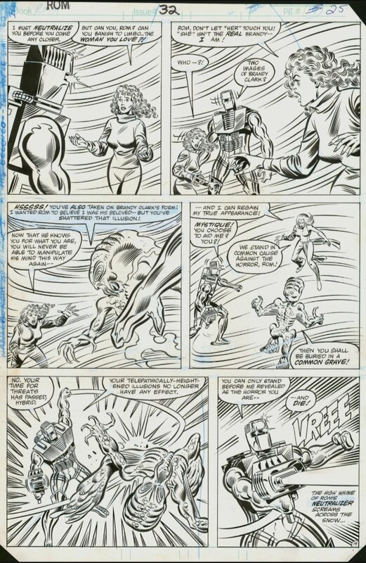 Je vous présente un exemple tiré du comic book « Rom », qui mériterait un exposé à lui seul, mais ce n’est ni l’heure, ni le lieu. Veuillez ne pas faire attention aux déformations de la case, qui sont dues à la prise de vues, mais uniquement aux couleurs.