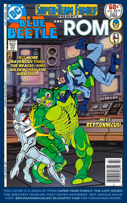 La troisième est extraite de l’édition française parue dans Strange n°140. Il y aurait d’autres choses à dire sur la publication de Rom dans Strange, et cet épisode l’illustre bien : il est censuré dans sa majeure partie et couplé à un autre épisode mutilé pour former quelque chose de consistant. Mais le sujet du jour est la couleur. À l’époque, les Éditions Lug faisaient systématiquement refaire les couleurs par leurs imprimeurs (en l’occurrence, Intergrafica, de Milan), justement pour éviter l’effet « benday ». Mais vous noterez l’effort qui est réalisé pour reproduire le dégradé de vert derrière Rom, le vaillant cyborg de l’espace.