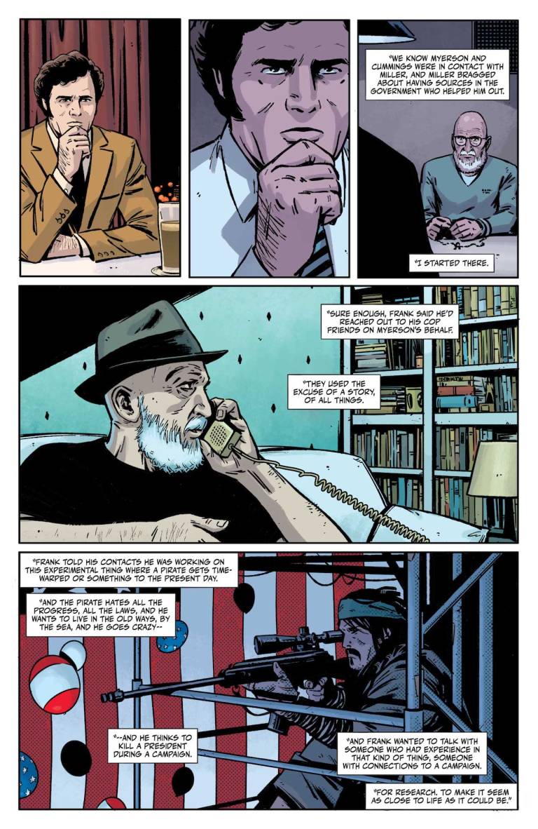 Wil Myerson might have been the creator of Pontius Pirate, the most popular comic in history, before he put on the Rorschach mask and tried to kill a would-be president, but he’s not the only artist who worked on the character. Other artists fell under Wil’s influence, and now all these years later, his more renowned acolyte has fallen sway to Laura, the #1 Myerson superfan. Is it possible she influenced another comic book legend into playing vigilante? The key here is that tape the detective is trying to decipher, the one with the séance that has been haunting him since the very first issue! All this and a cameo by Dr. Manhattan to boot!