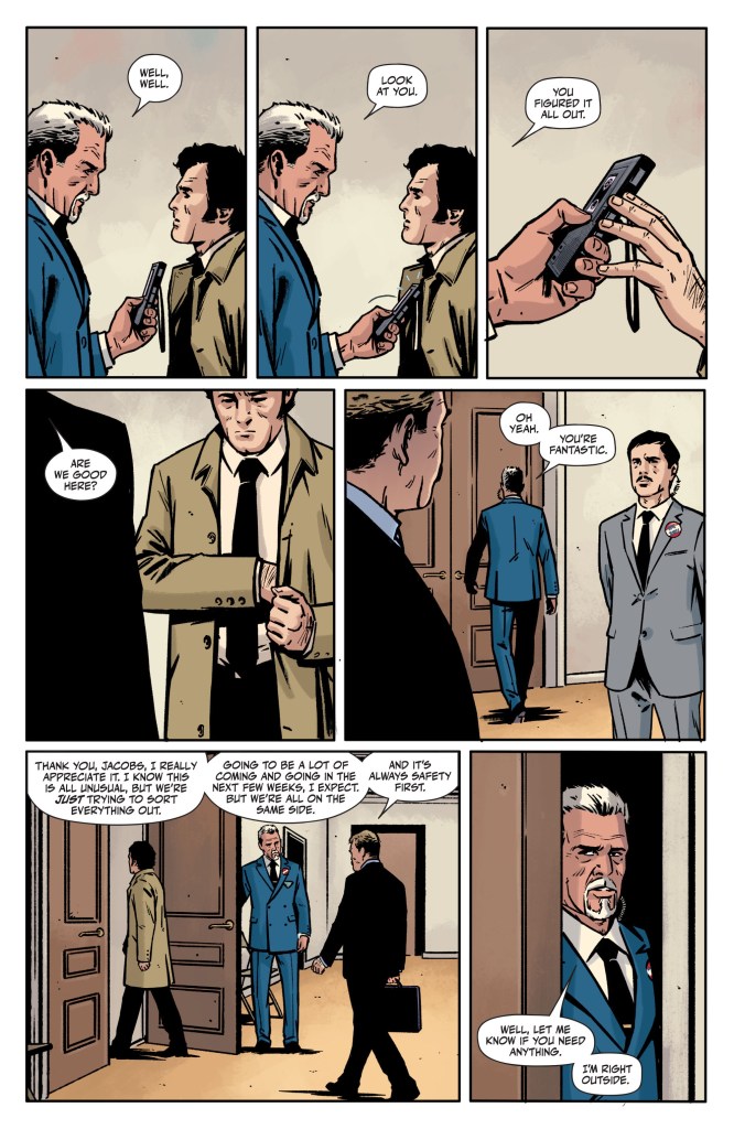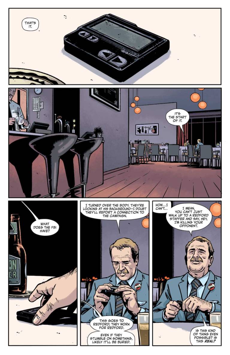 Art by: Jorge FornesTo solve the attempted murder, the detective on the scene must first solve an actual murder. Before Rorschach and Laura can carry out their ill-fated plan to kill a presidential candidate, they first have to find a way into his political rally. Once that detail is uncovered, the rest should snap into place- especially if it turns out that their inside man was part of the rival campaign. The only problem is that man is dead, potentially killed by the very people he was trying to help, and as everyone knows, dead men tell no tales. Thank goodness, then, that crime scenes do! There’s only one more issue to go after this. Don’t miss out on one of the most intriguing comics of the year!