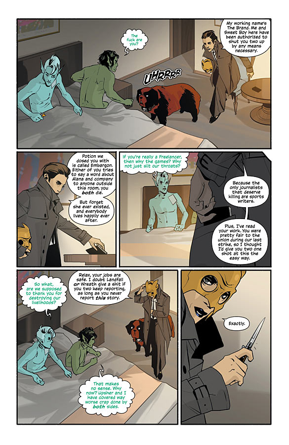 But Image warned us that we might get pushback from retailers and our distributors, especially because some stores out there have apparently already stopped displaying our first trade paperback because some customers complained about that comparatively tame image of Alana breastfeeding her baby. I think that’s insane, especially given how many covers out there literally feature severed human heads, but so it goes.