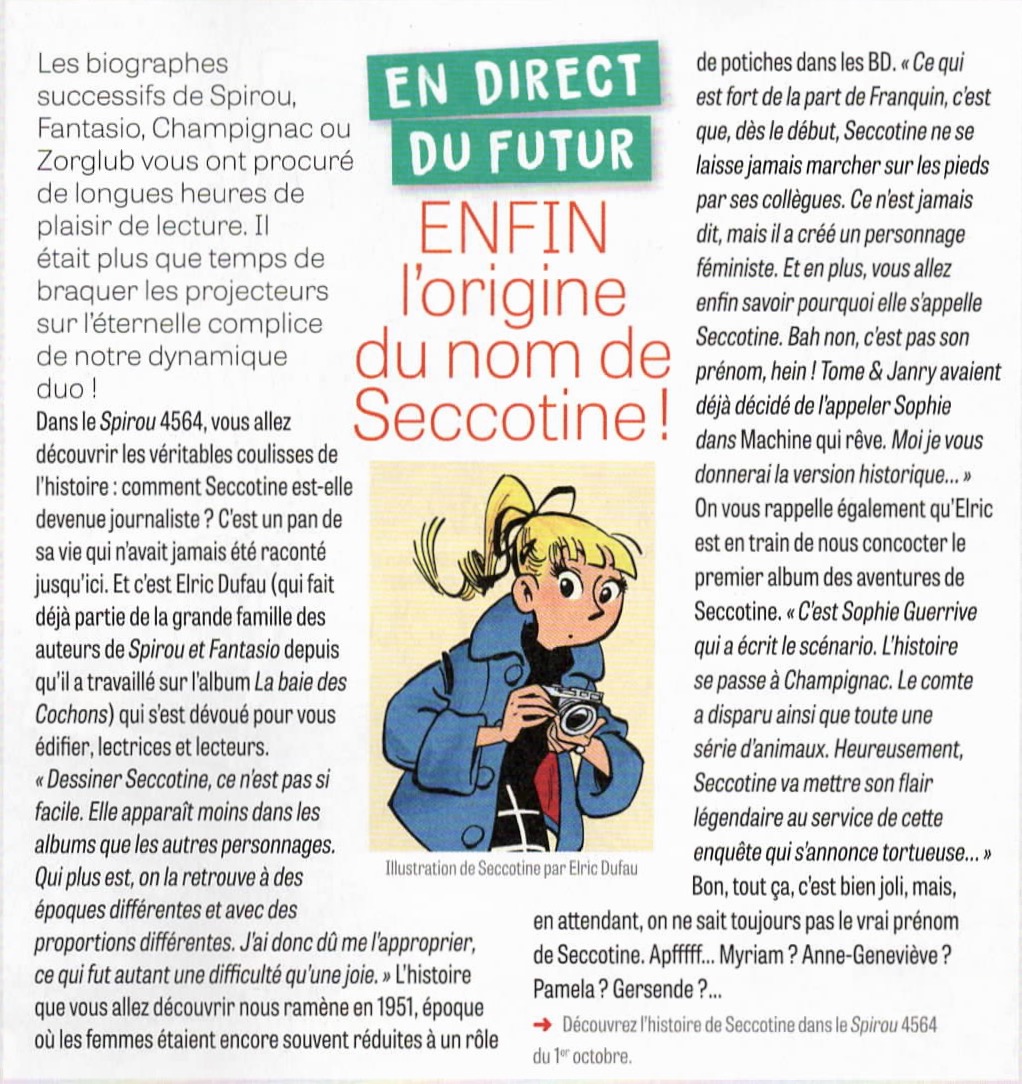 PS : on attend encore confirmation… qui n’arrivera jamais… En effet Stéphane Beaujean, directeur éditorial chez Dupuis, souligne qu’il y aura bien un projet « Seccotine », mais avec Sophie Guerrive au scénario - et donc pas encore de dessinateur de confirmé !