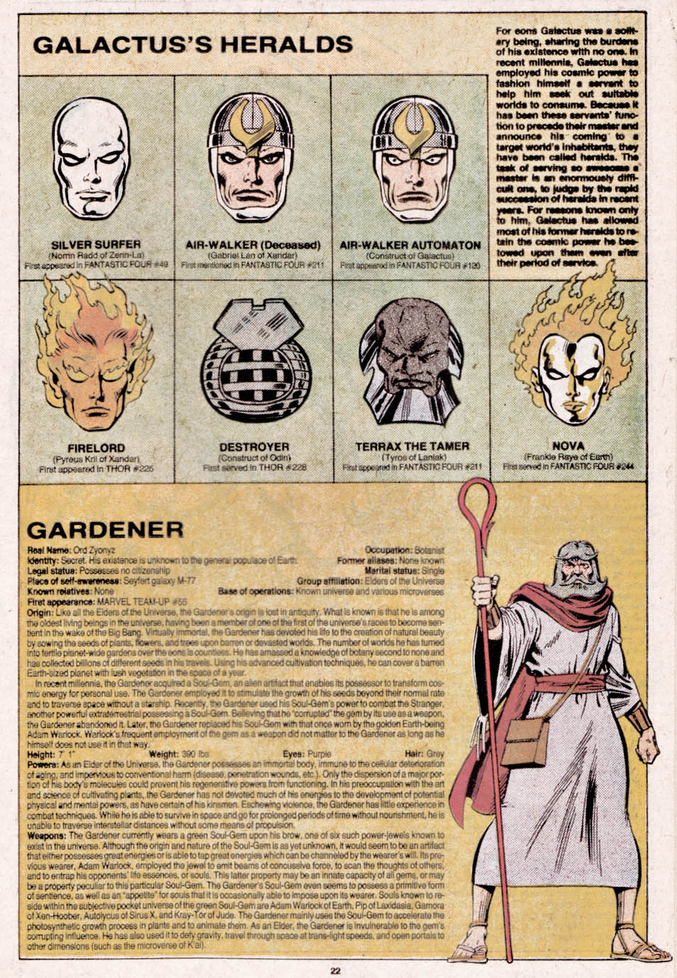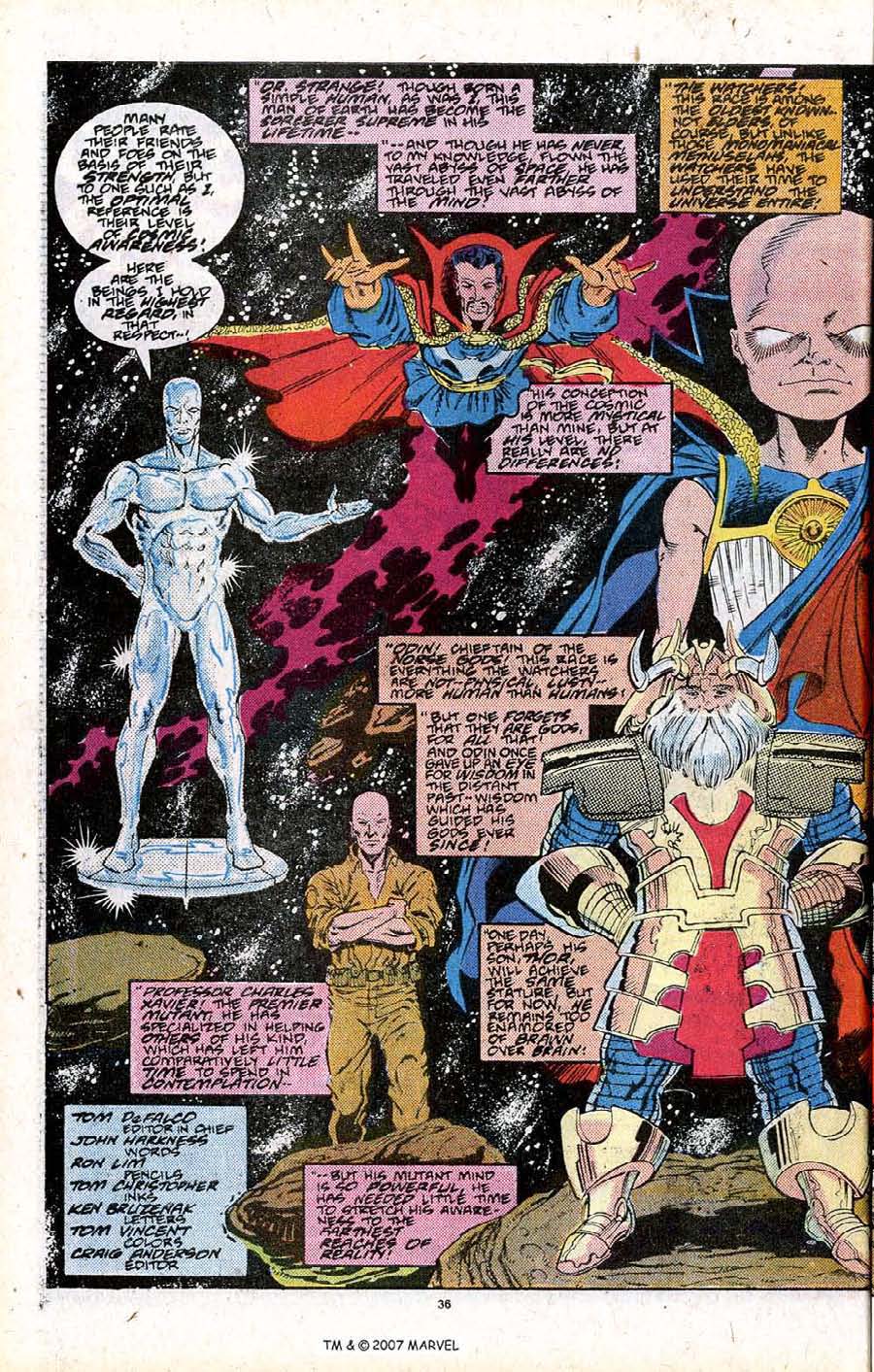 Le projet de Lofficier visait ainsi à constituer une sorte de synthèse, en reliant diverses histoires éparses (« The Ultimate Cosmic Experience » et « Parable », les numéros 6 et 18 de la première série de 1968) par le biais d’un team-up entre le Surfer et Strange, annonciateur de leur future association au sein de l’équipe des Défenseurs.