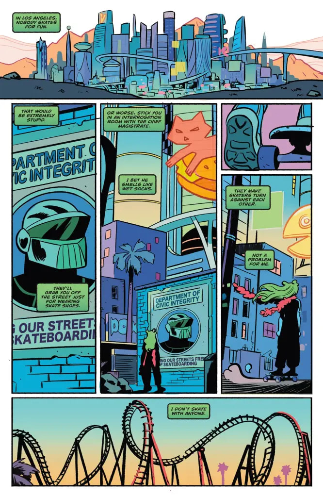 Welcome to near-future Los Angeles—a neon-scorched city where skateboarding has been ruthlessly outlawed. But nothing stops Skate Ali.