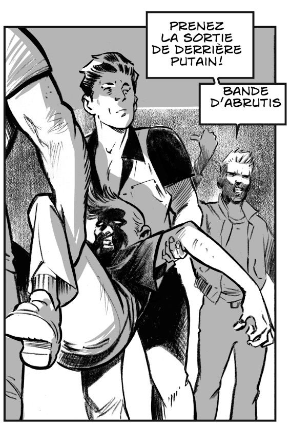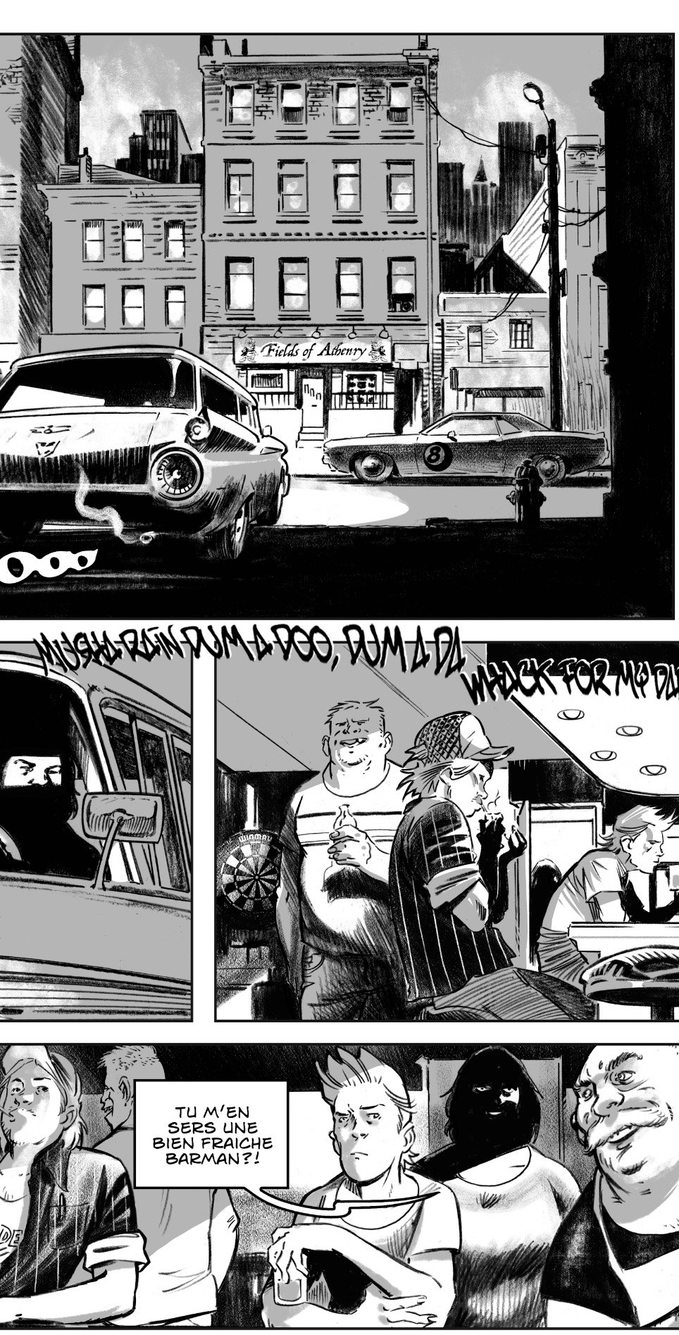 Boston, 1974. les scènes de rues sont un exercice en bd particulièrement intéressant. juste deux personnages qui se parlent et faut rendre ca fluide et naturel. Pas d’effets spéciaux , pas de dinosaures , pas d’explosions …rien , juste deux personnes qui se rapprochent. 71 planches sur 200 à raison de deux planches par semaines, on avance ( dialogues pas encore relus, c’est juste le placement pour le lettreur et moi même pour definir les tailles des bulles). Dessins et mise en scène de moi , et textes de Dennis Lehane.(j’ai une totale aversion pour les réalisateurs de films qui gomment les auteurs de romans sur leurs affiches…les crevards du chaos !)