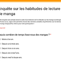 Dans le cadre de mon mémoire de fin d’études, j’essaye de savoir comment les gens lisent des mangas aujourd’hui. Que vous en lisiez beaucoup ou non, pouvez-vous m’aider en répondant à ce questionnaire :