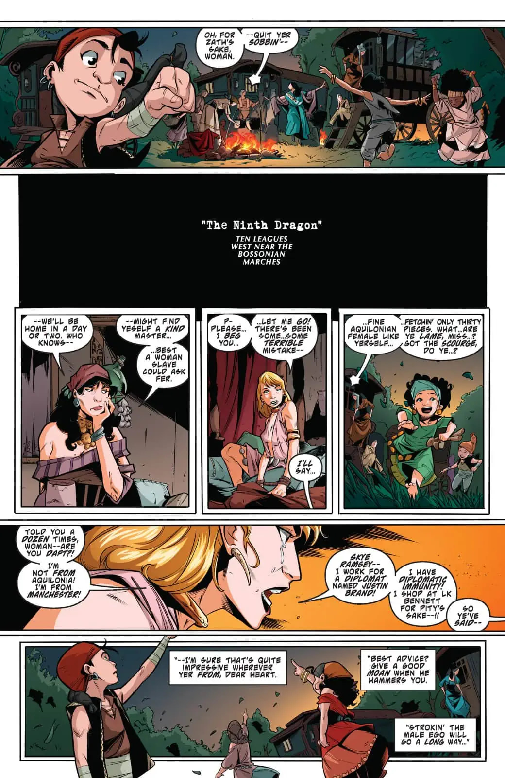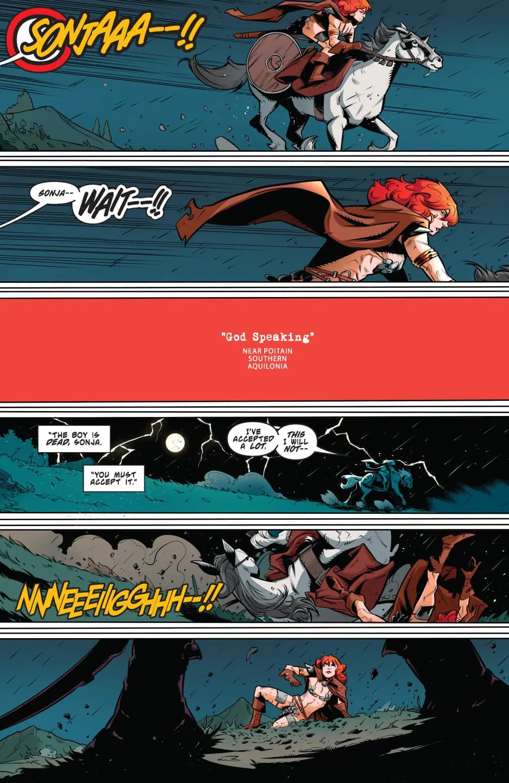 Convinced she is either dreaming, hallucinating, or possibly dead, the recently reconstituted Red Sonja (formerly Maggie Sutherland, late of the UK) decides that her best shot at escaping her apparent nightmare is to simply permit the worst to happen. This places her young squire and ersatz teacher-slash-tour-guide Faolán at great risk, as it falls to him to wake Sonja up to the fact this is really happening — before she succeeds at getting both of them killed!