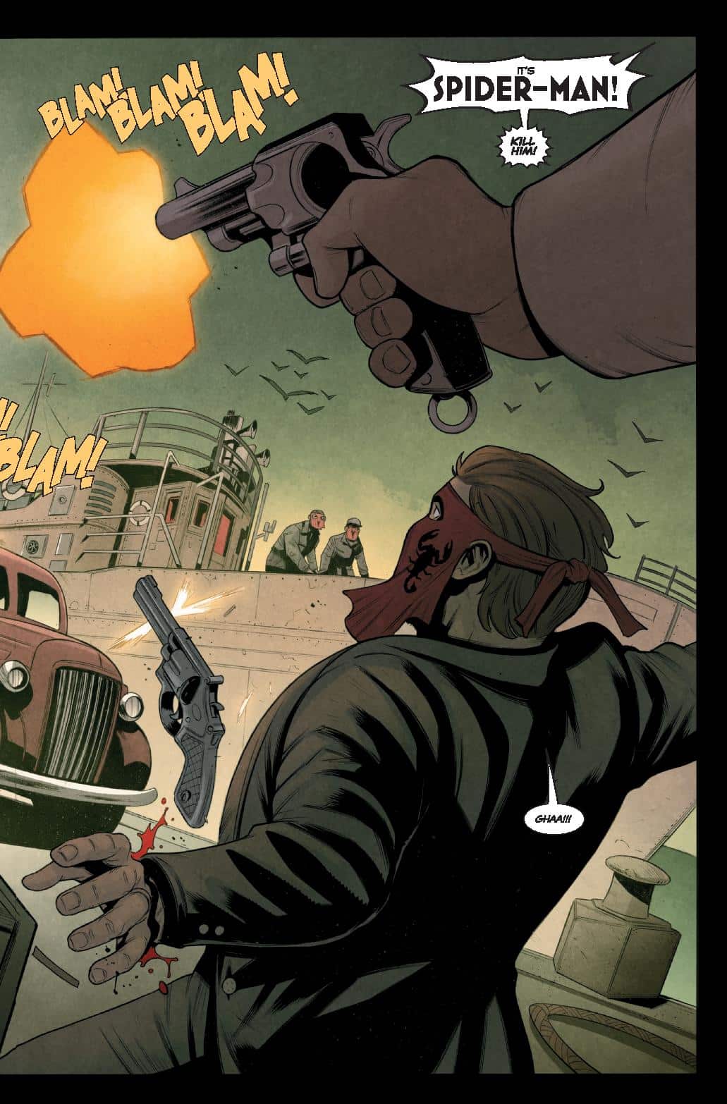 Sympathique et dynamique lancement. Erik Larsen s’empare du Spider-Man Noir, qui évoque rapidement ses errances multiverselles et qui revient chez lui. Et 1939 est une année difficile : quasi expulsé, largué par MJ, suivi par Tante May malade mais qui sait pour son identité, et sans contrat pour son job de détective privé. Il s’en prend au Scorpion Gang, dont certains meurent dans une bagarre brutale où il glisse de nombreuses piques. Il file ensuite, et a chez lui une cliente enfin : Gwen Stacy, qui veut la vérité sur son père tué aux docks alors qu’il était un policier propre, lui. Peter se lance dans l’enquête, ne comprend pas les bâtons dans les roues des policiers, puis il combat un espion nazi volant. Mais Peter comprend finalement que George Stacy était membre du Scorpion Gang, et serait mort par sa faute…