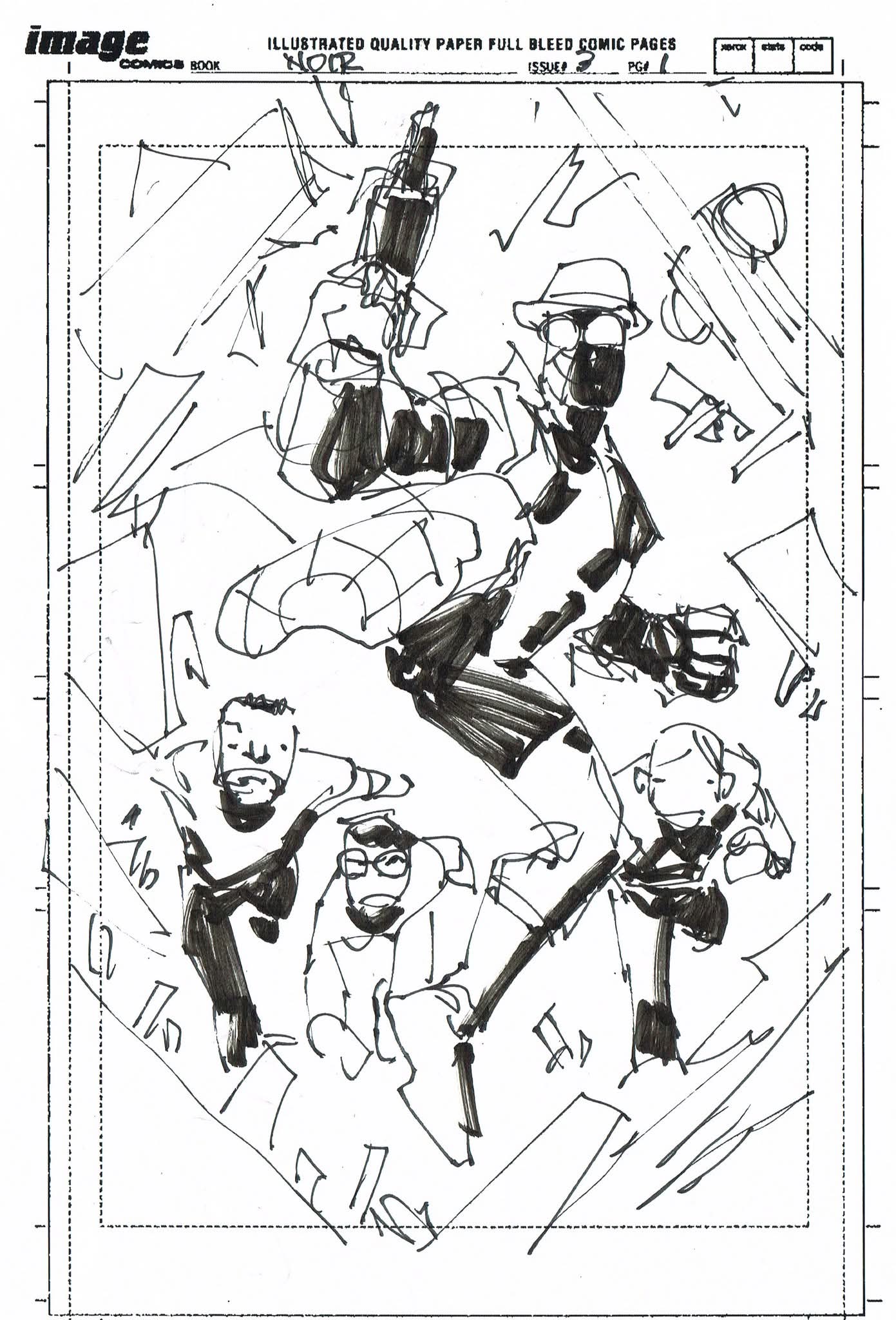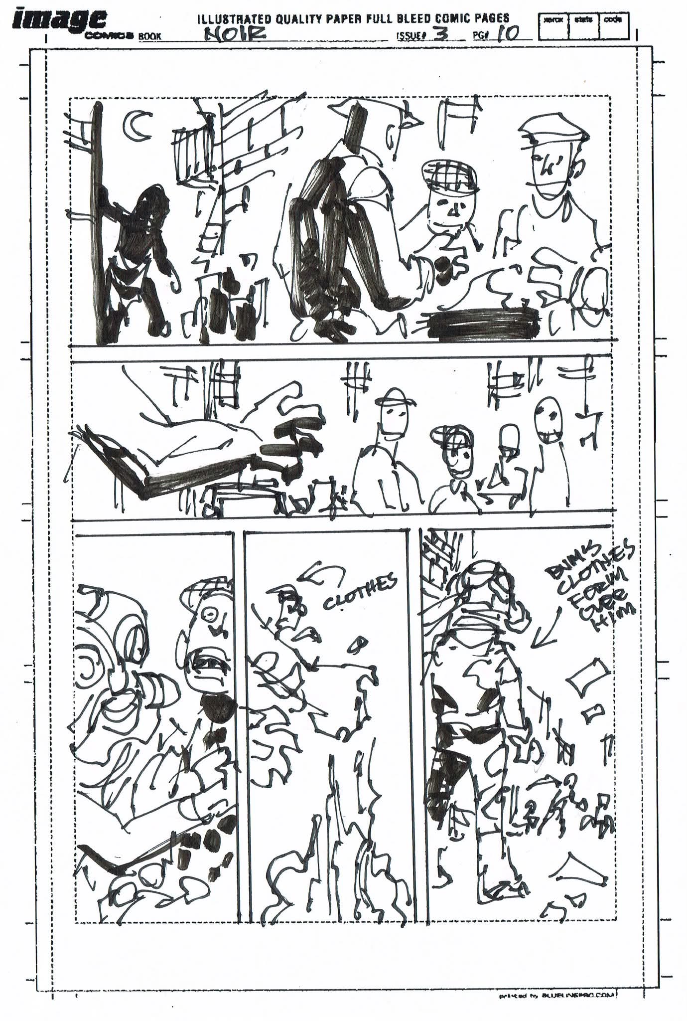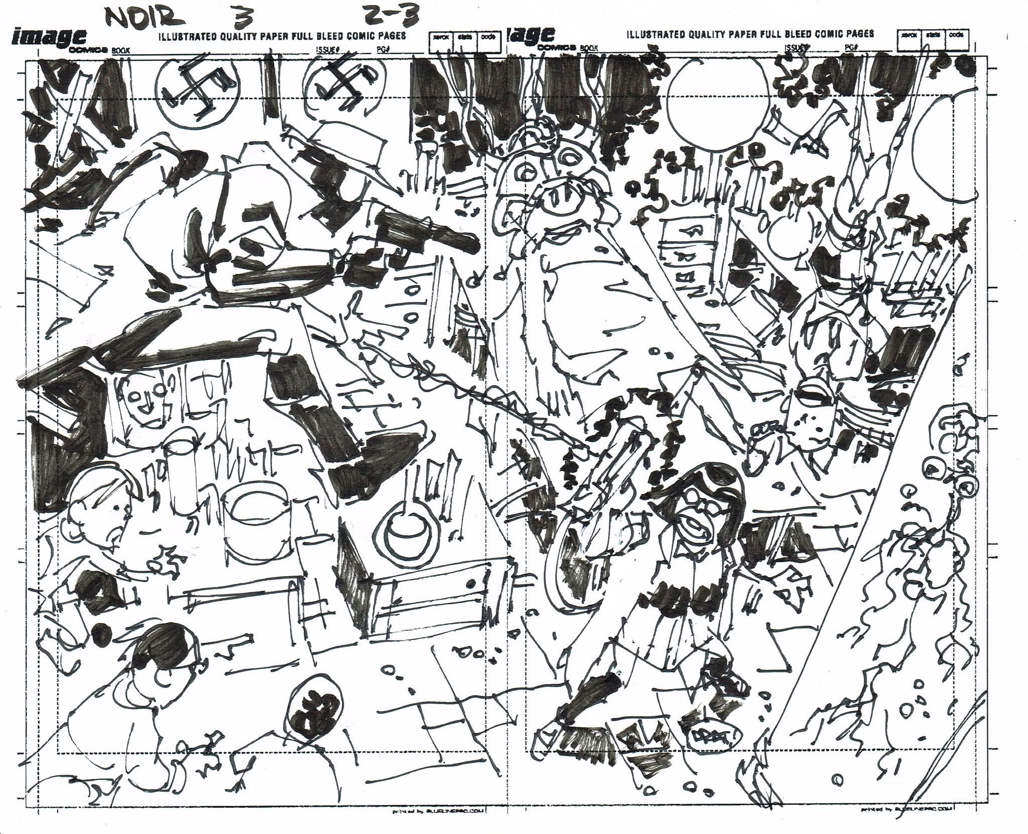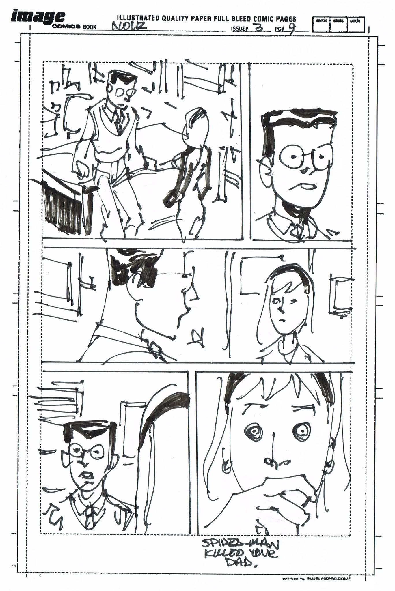 The artist that filled in on Spider-Man Noir #3 had never worked from a plot before and I was asked to draw thumbnails for my story. I sent in the first 10 pages to get them started but they went ahead and laid out the rest before I could get the second batch to them. I’m sharing them all with you. (SPOILERS to those who haven’t read the third issue)