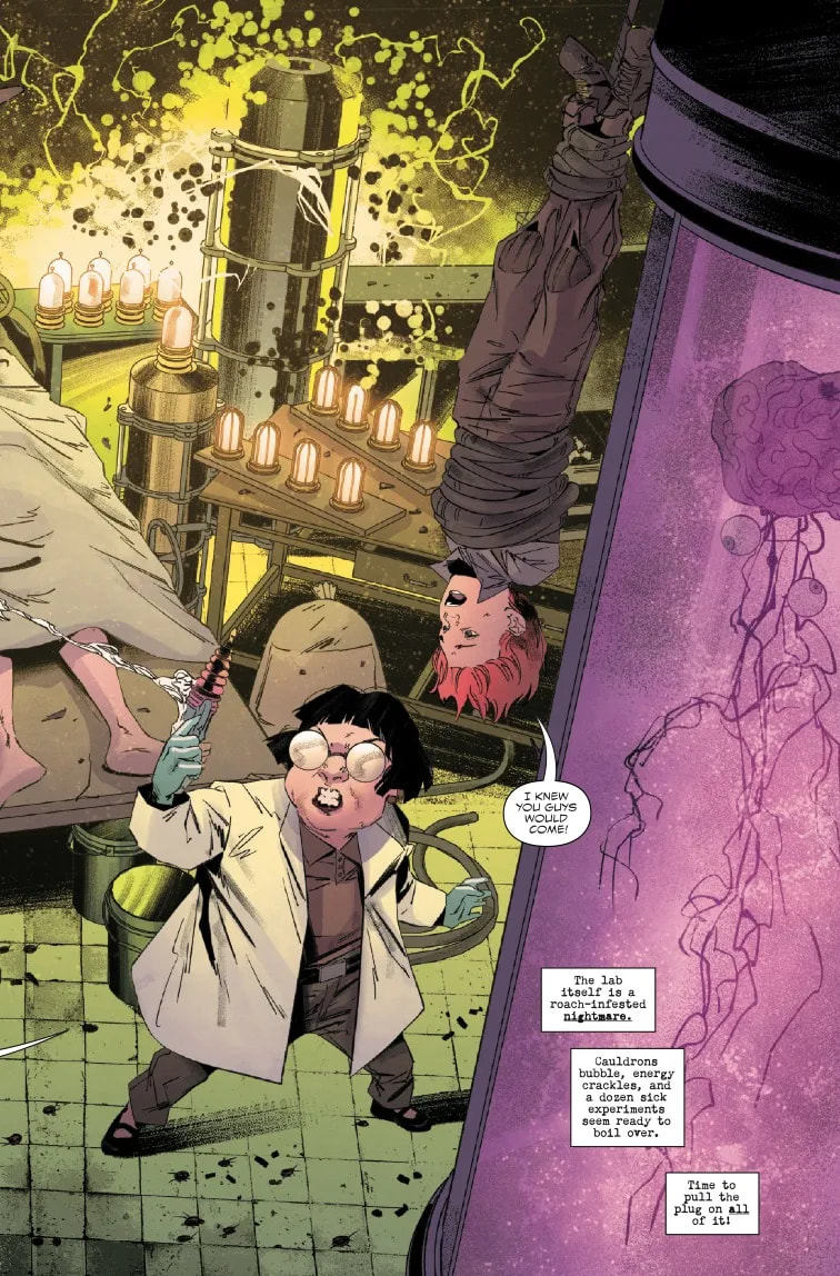 Sympathique en soi, mais trop bavard et en soi un peu creux. Erik Larsen enchaîne en montrant Spider-Man Noir sauver un gamin des rues pris dans une expérience de savante folle nazie, en confrontant sa créature Plasma-Man. Il comprend que le gamin a été enlevé pour la gemme que l’enfant lui a confié ensuite, mais Peter l’a perdue. Il révèle à Gwen, avec qui il couche, que Spider-Man a tué son père, sans lui révéler son identité. May et MJ le critiquent à ce titre, et il re-combat Plasma-Man puis le stoppe. Mais Gwen lui demande ensuite d’enquêter pour trouver qui est Spider-Man…