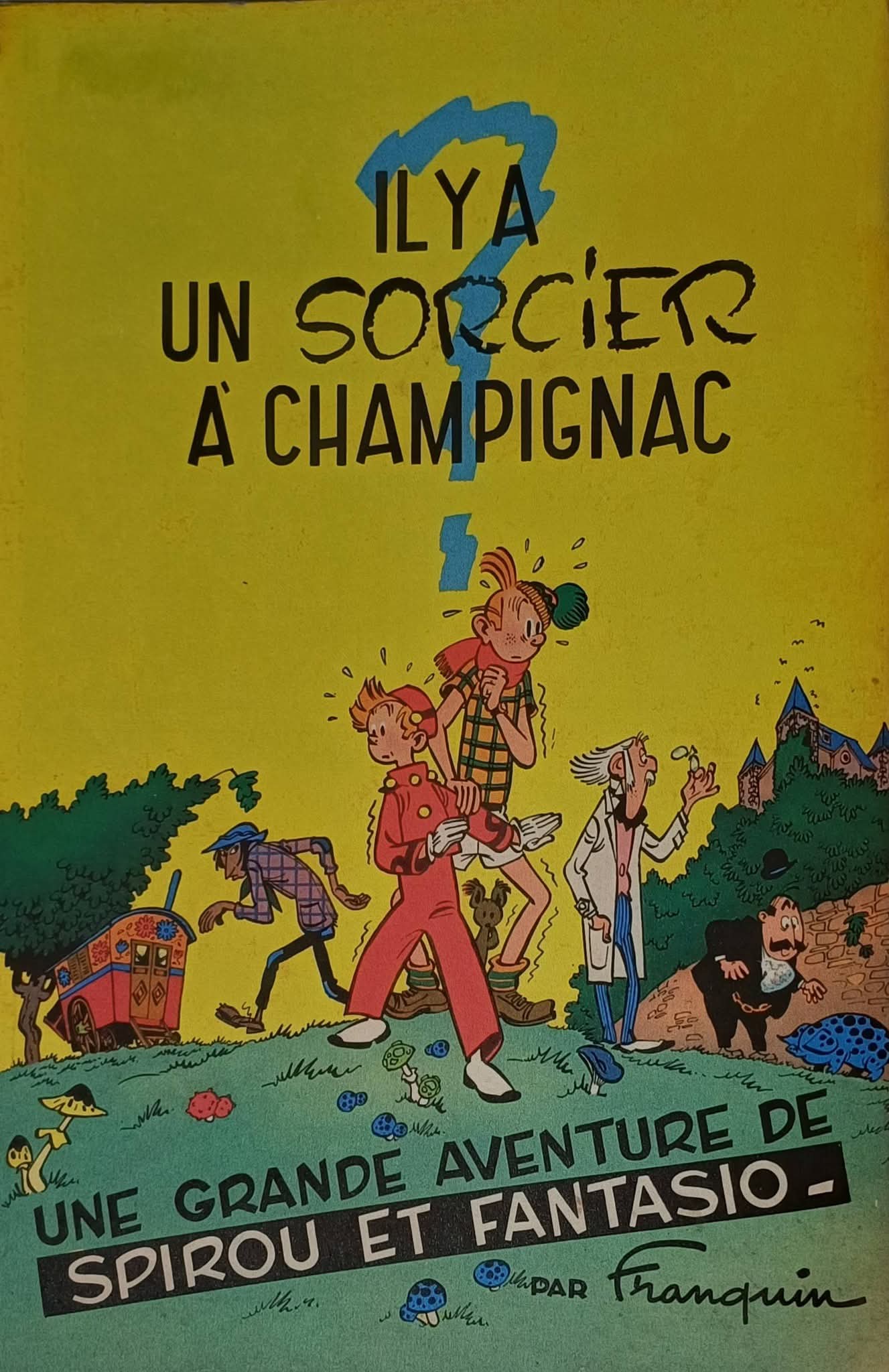 Couverture de Franquin pour Clarim e Fantásio, O feiticeiro de Vila Nova de Milfungos, la première édition portugaise de Spirou et Fantasio, Il y a un sorcier à Champignac, parue en 1967.