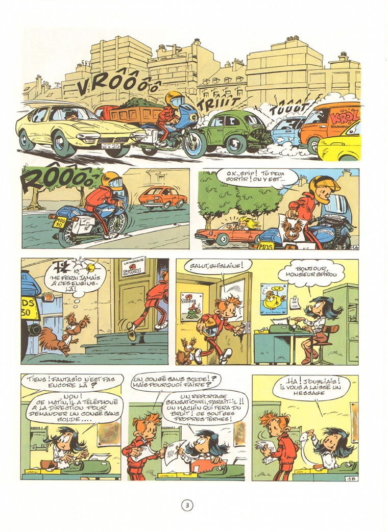Mais en fait, c’est pas mal. Clairement pas l’un des meilleurs moments de la série, mais ça se lit bien, c’est rythmé, c’est équilibré, c’est maîtrisé. Fantasio utilise le contenu de la fameuse « boîte noire » du titre pour inventer un nouveau véhicule, et attire la convoitise de malfrats (aperçus dans le tome précédent, je crois). On a donc droit à une course-poursuite à base d’un McGuffin flou, mais Cauvin sait faire et l’album ne souffre ni de déséquilibre ni de temps mort. On remarquera cela dit une forme d’inversion de la caractérisation, Spirou se montrant prudent voire méfiant là où Fantasio est parfois plus velléitaire voire aventureux : mais le tandem fonctionne quand même assez bien, sans réelle contradiction avec ce qu’on sait d’eux.