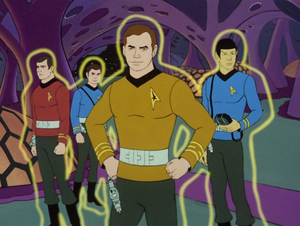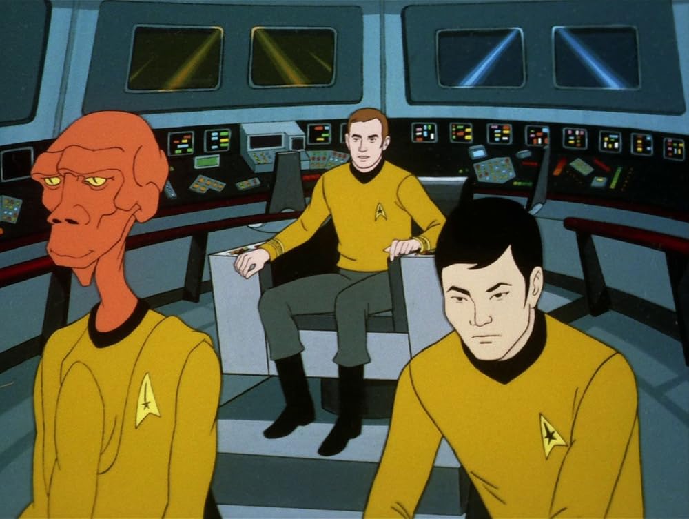 Star Trek : The Animated Series était une production Filmation et qui dit Filmation, dit animation (très) limitée…pour ne pas dire cheap (on leur doit notamment les dessins animés DC des sixties ou encore Blackstar, Musclor et T’as le bonjour d’Albert). Cheap jusque dans le casting vocal puisque Filmation ne voulait pas utiliser la distribution complète de la série pour réduire les coûts et c’est Leonard Nimoy qui a insisté pour que Nichelle Nichols et George Takei reprennent leurs personnages de Uhura et Sulu (mais pas que puisqu’il était d’usage que les acteurs dit « secondaires » s’occupent de plusieurs voix dans chaque épisode, là encore pour des questions de budget). Seul Chekov est absent du dessin animé, remplacé par deux nouveaux membres d’équipage extra-terrestre. Walter Koenig a tout de même pu participer à la production, en écrivant le scénario d’un épisode de la saison 1.