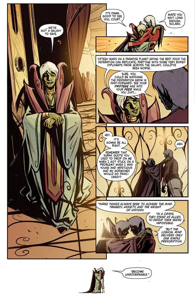 For 23 years, the delegates have been left to their own devices, to stew in their own machinations and to make new allegiances… and while the U.S.S. Omega may have brought them all together, the Burn has forced them apart. Not all want to broker peace, and someone who was once closest to Starfleet may become its greatest adversary…