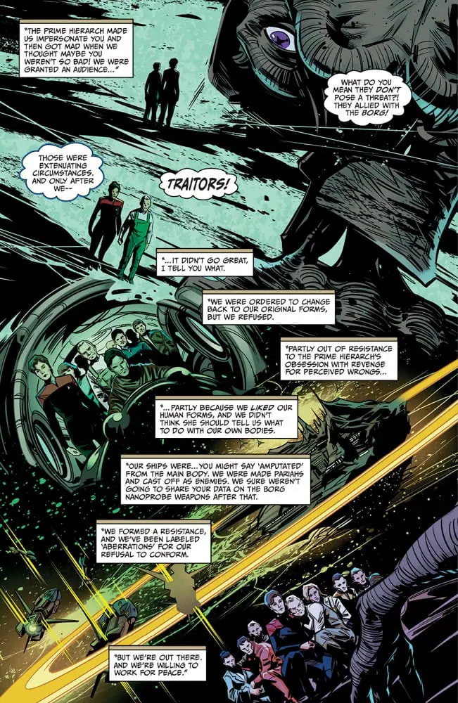 Stuck between a rock and a hard place, Captain Janeway and the Voyager crew agree to ally with a collection of Borg deep in fluidic space, and Seven plunges into the collective. They may be Borg, but there’s something… strange about them. Something alluring. Especially when it comes to a particularly individualistic member, Nine. Together, Nine and Seven might be able to build a deflector and help their crew members escape back to normal space — but that’s assuming they stay hidden from Species 8472 bent on their elimination.