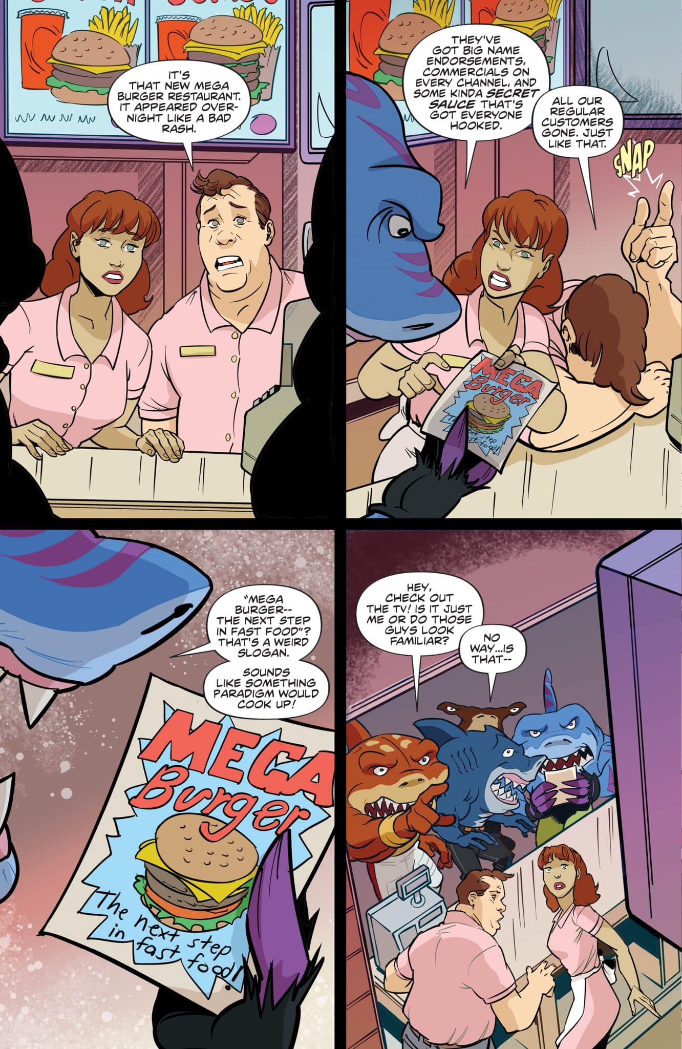 There’s a new burger chain in Fission City, and no one is happier than the Street Sharks! But when the success of the new Mega Burgers threatens the Sharks’ favorite restaurant, Humongo Burger, that becomes a problem. And when their enhanced senses detect something fishy about Mega Burgers’ food, the Sharks know that Dr. Paradigm is involved. Could this be another ploy to turn the city’s populace into gene-slammed monsters? Probably!