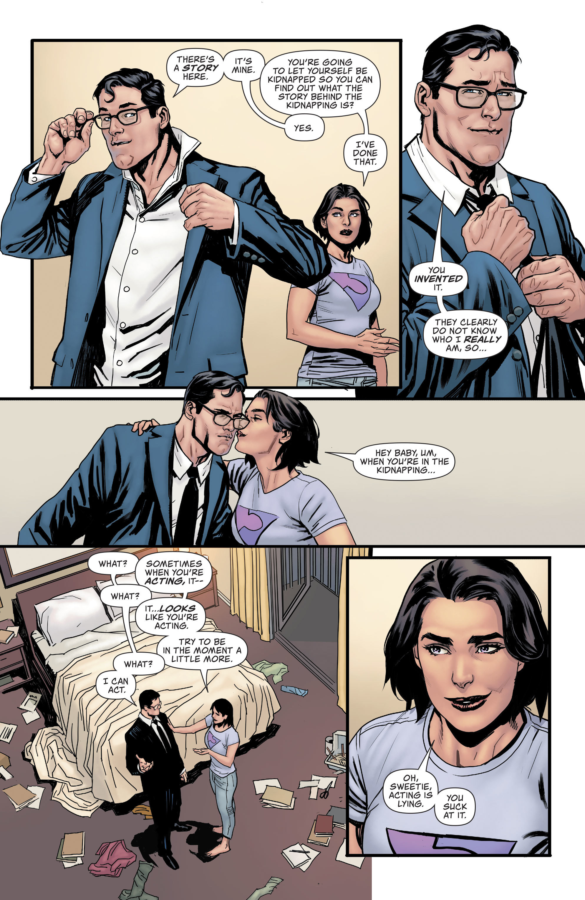 Alors que Leviathan a anéanti toutes les organisations secrètes de DC, le nouveau « maître » de l’organisation rencontre la cheffe secrète du crime de Metropolis ; pour savoir comment elle, elle s’en prendrait à Superman. L’idée est reprise par Talia, qui enlève Clark Kent plutôt que Lois. Clark se laisse faire, happé par l’idée de faire une « histoire » autour de ça, mais Talia lui met un poitrail en Kryptonite pour affaiblir Superman quand il arrivera ; problème. Lois bat le rappel des alliés, Jimmy Olsen est dans de sales draps en se retrouvant marié après une nuit alcoolisées dans Gorilla City, à une super-voleuse extra-dimensionnelle. Supergirl, elle, se rend compte que sa famille d’adoption a des difficultés, a priori en lien avec l’intrigue principale ; mais la vie conjugale va révéler des secrets que la fille adoptive va avoir du mal à gérer. Clark finit par être aidé, sauvé rapidement, mais le nouveau « maître » s’en prend violemment à Talia… avant que le pire ne se déclenche, directement.