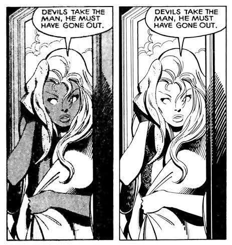 Ferran Delgado : « Austin drew the nipple in the original art with the knowledge that the adhesive screentone he added over it would cover it once printed (left image). It was a prank to scare the editor. What he didn’t foresee is that this stuff would be reprinted in the future with better paper (in Essentials), revealing it. From X-Men #123. »