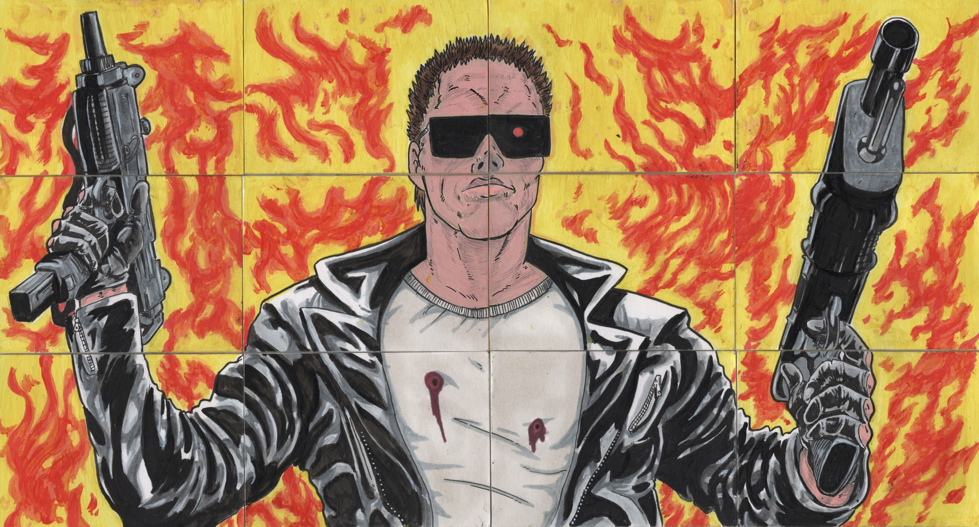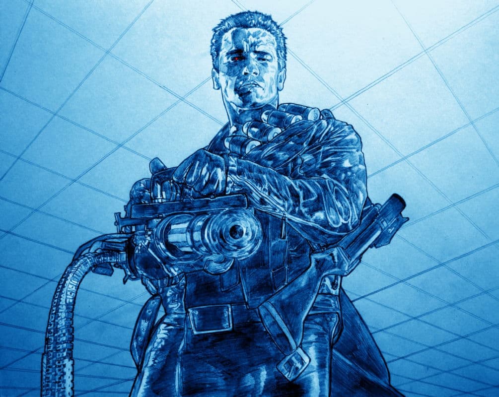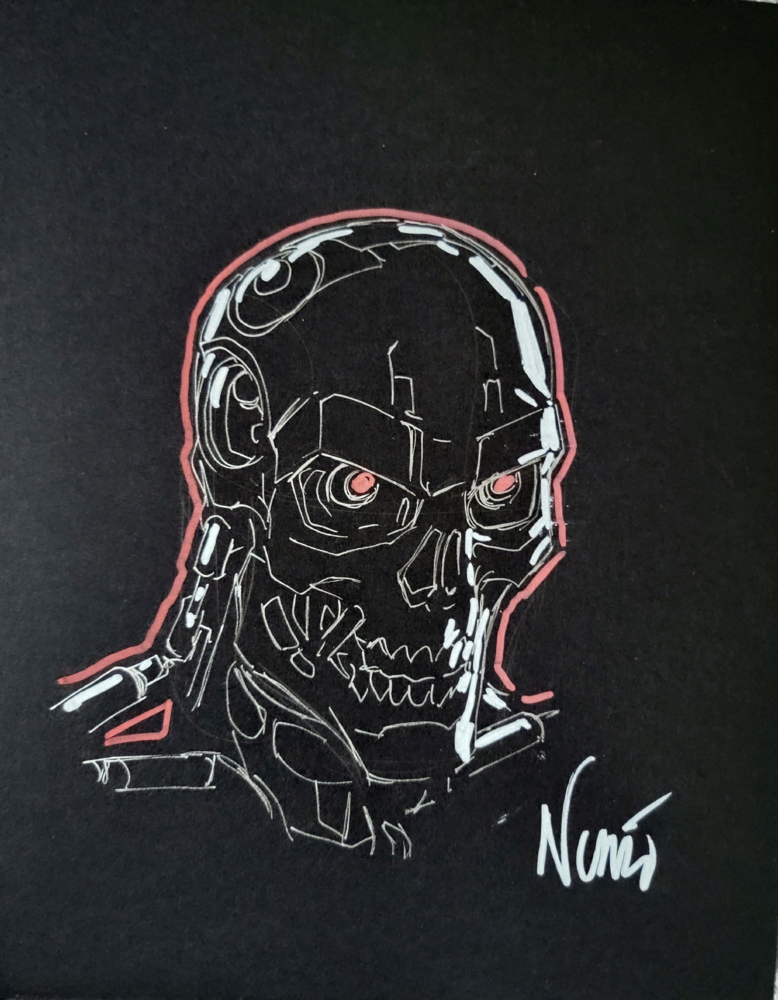 Le tout premier concept-art du Terminator, dessin signé James Cameron avec Lance Henriksen (que Cameron venait de diriger sur Piranha II) en modèle :