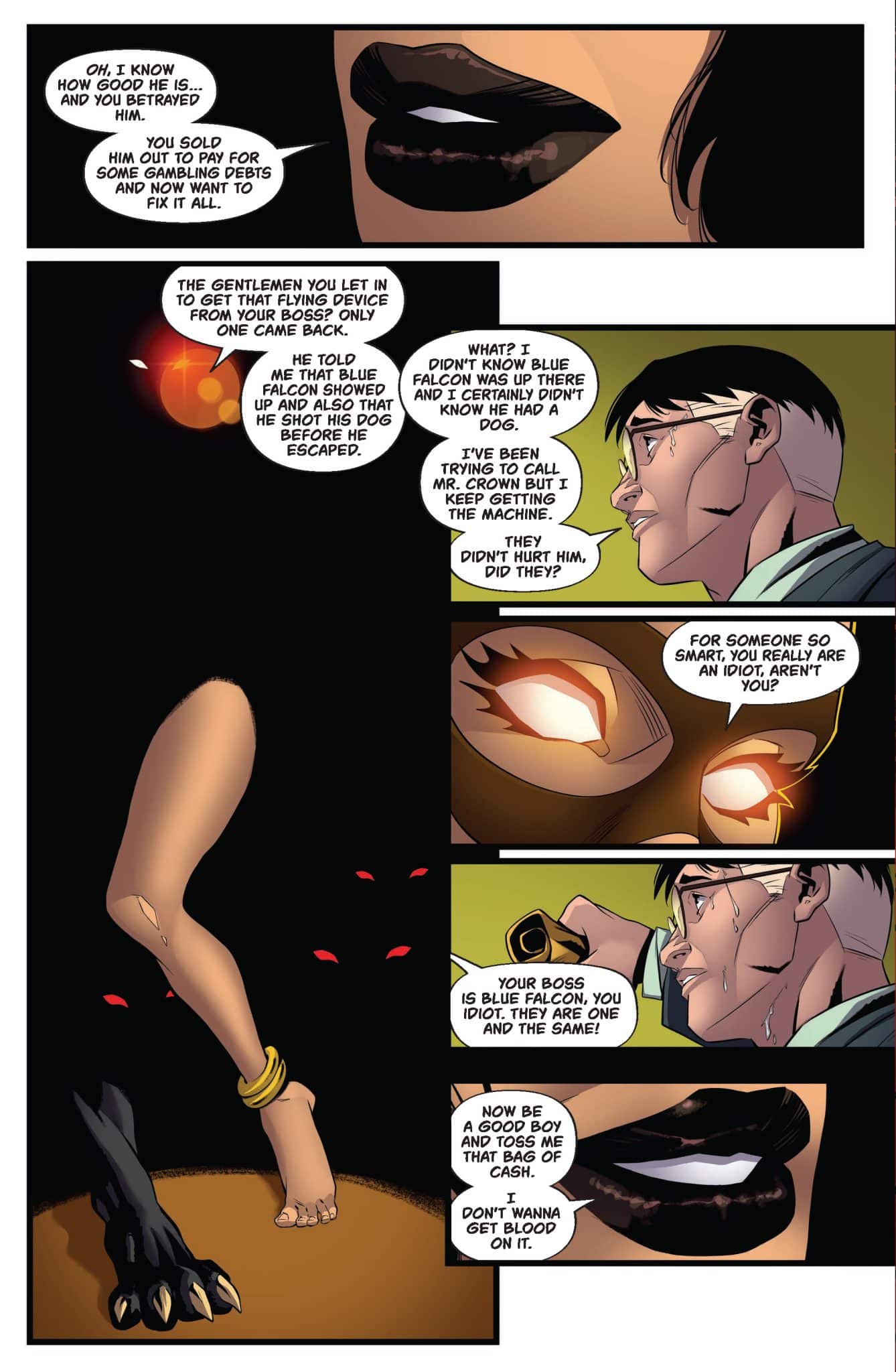 DYNOMUTT UNLEASHED! In this issue: After saving a bus full of civilians from a deadly explosion, a critically injured Blue Falcon is rushed to the hospital — leaving him vulnerable to retaliation from the criminal elements he has been targeting so effectively. One villain in particular is determined to have her vengeance on Big City’s cowled defender. But the furious feline power of Beastwoman is about to meet its match in the form of a new, augmented, and cybernetically enhanced Dynomutt!