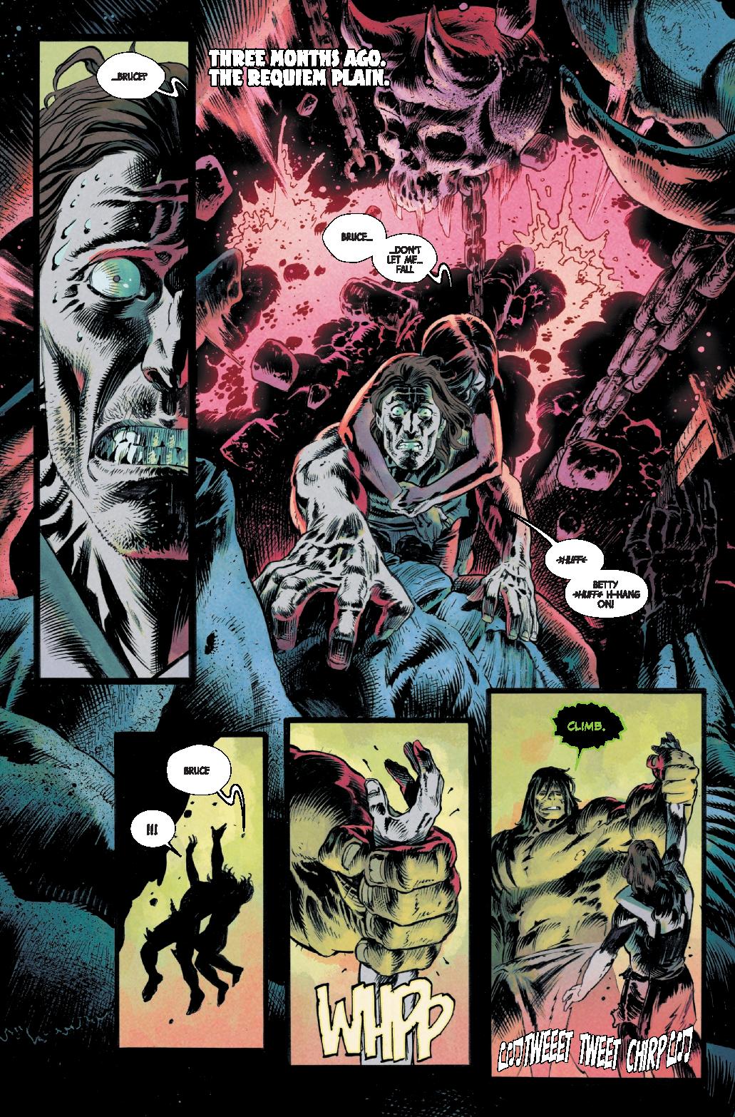 Intense. Phillip Kennedy Johnson coupe rapidement dans sa saga où The Eldest possède le corps de Hulk afin de s’intéresser à Bruce… et à Betty, qui vivent des existences ordinateurs de scientifiques basiques dans une petite ville, sous de faux noms. L’on apprend qu’ils ont échappé aux sous-sols horrifiques du Nevada grâce à Skaar, qui les a sortis de là, et ils ont fui depuis. Ils semblent bien intégrés, mais Betty est en plein stress post-traumatique, avec des visions et des pulsions d’auto-destruction car elle ne supporte pas d’être redevenue si humaine et faible. Bruce gère mieux ses pulsions, mais il est retrouvé et interpellé par Mr Fantastic & Iron Man, à qui il confie ses réponses mais ne veut plus intervenir, même quand Tony le traite de lâche. Sauf qu’il apprend le lendemain que le fils militaire d’une collègue a été tué par The Infernal Hulk…