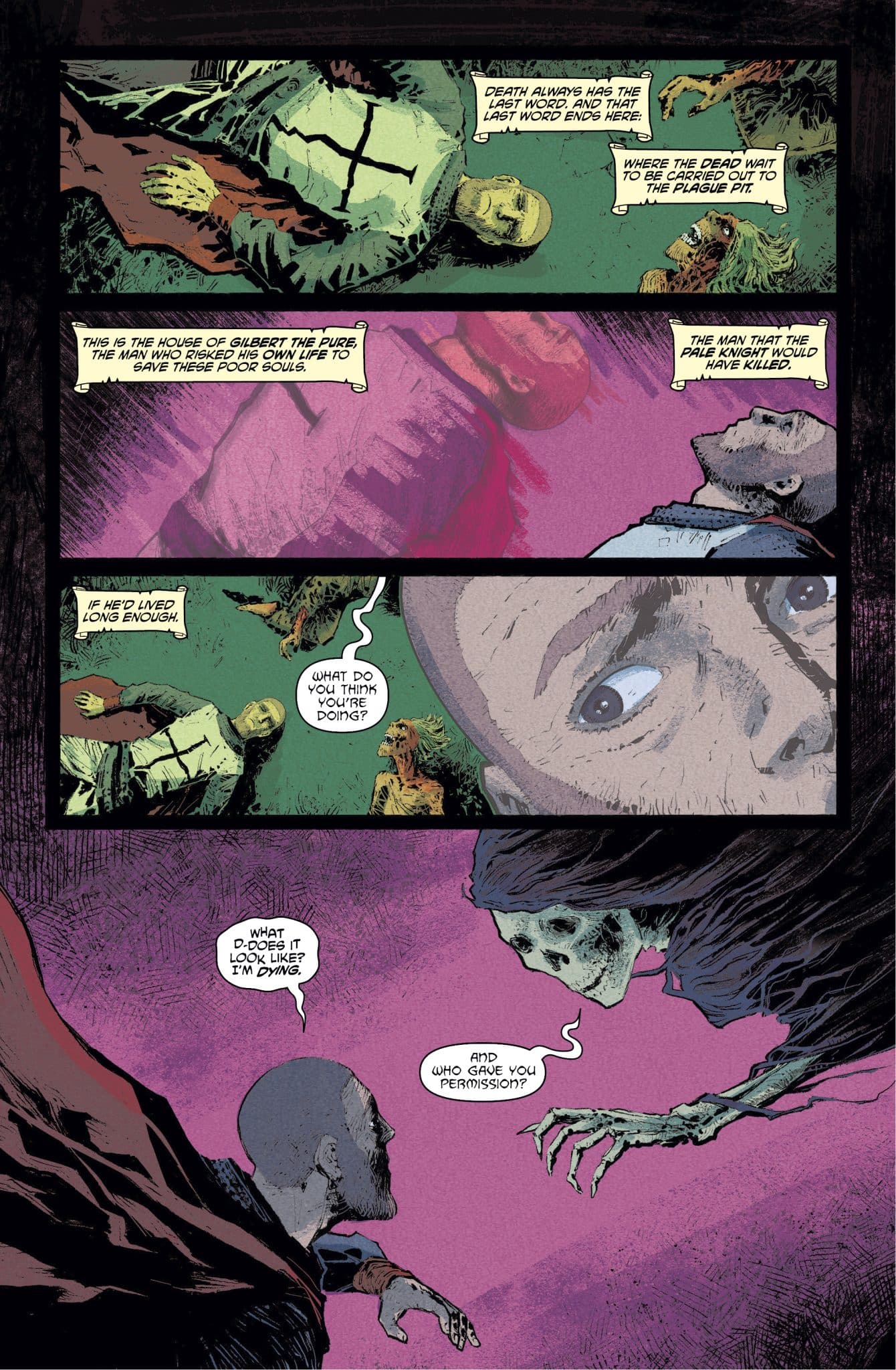 “The Pale Knight has a particular, terrible resonance, set as it is in a world suffering from an even deadlier plague that decimated populations in the 1340s,” said Peter Milligan in a press release from Mad Cave Studios. “This book blends my love for Bergman’s iconic The Seventh Seal with my fascination for the Black Death to craft a horror story that feels both timeless and disturbingly modern. Val Rodrigues’s stunning art brings this apocalyptic world to life in a way that perfectly captures the moral torment and supernatural horrors of this tale.”