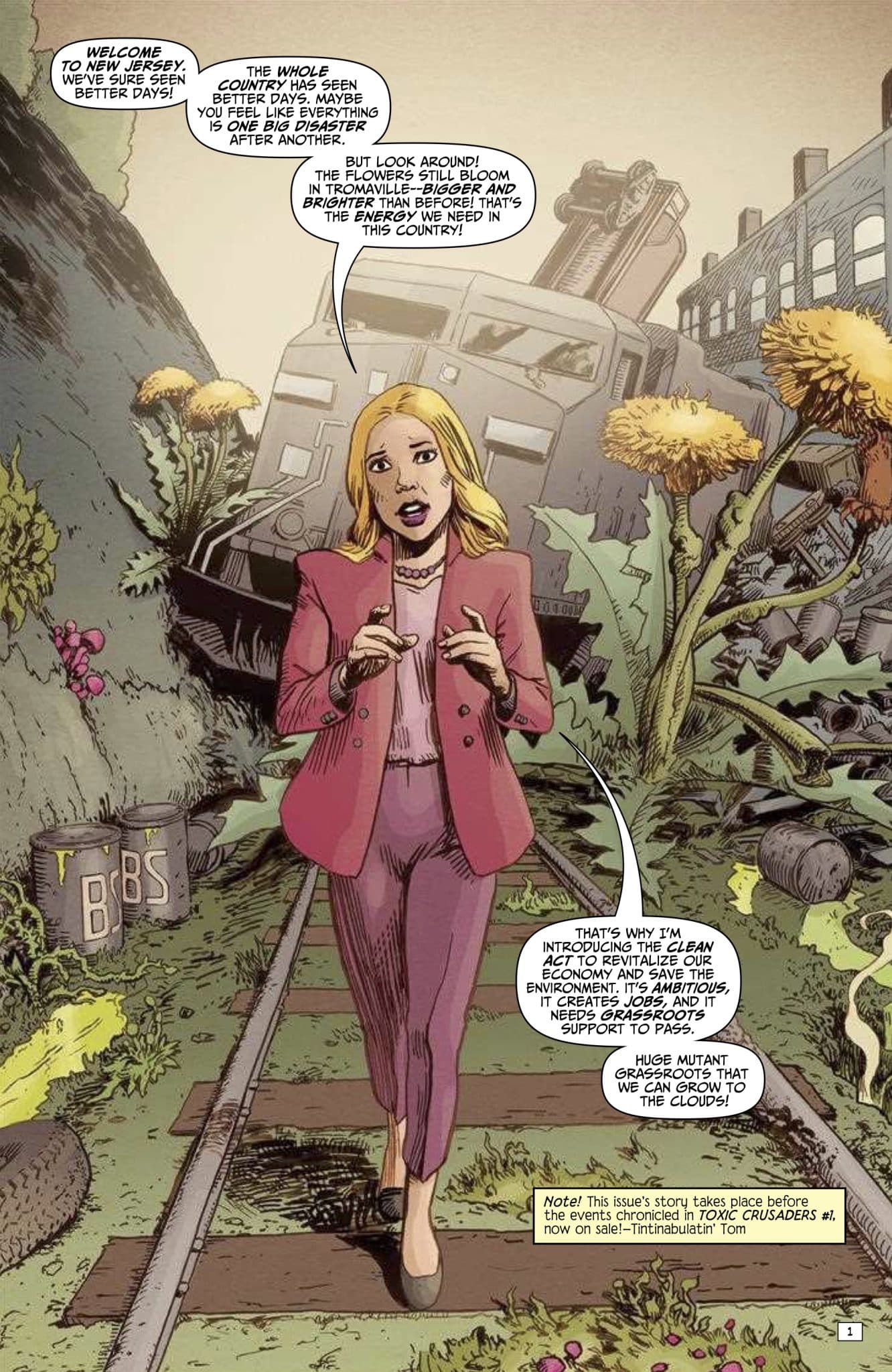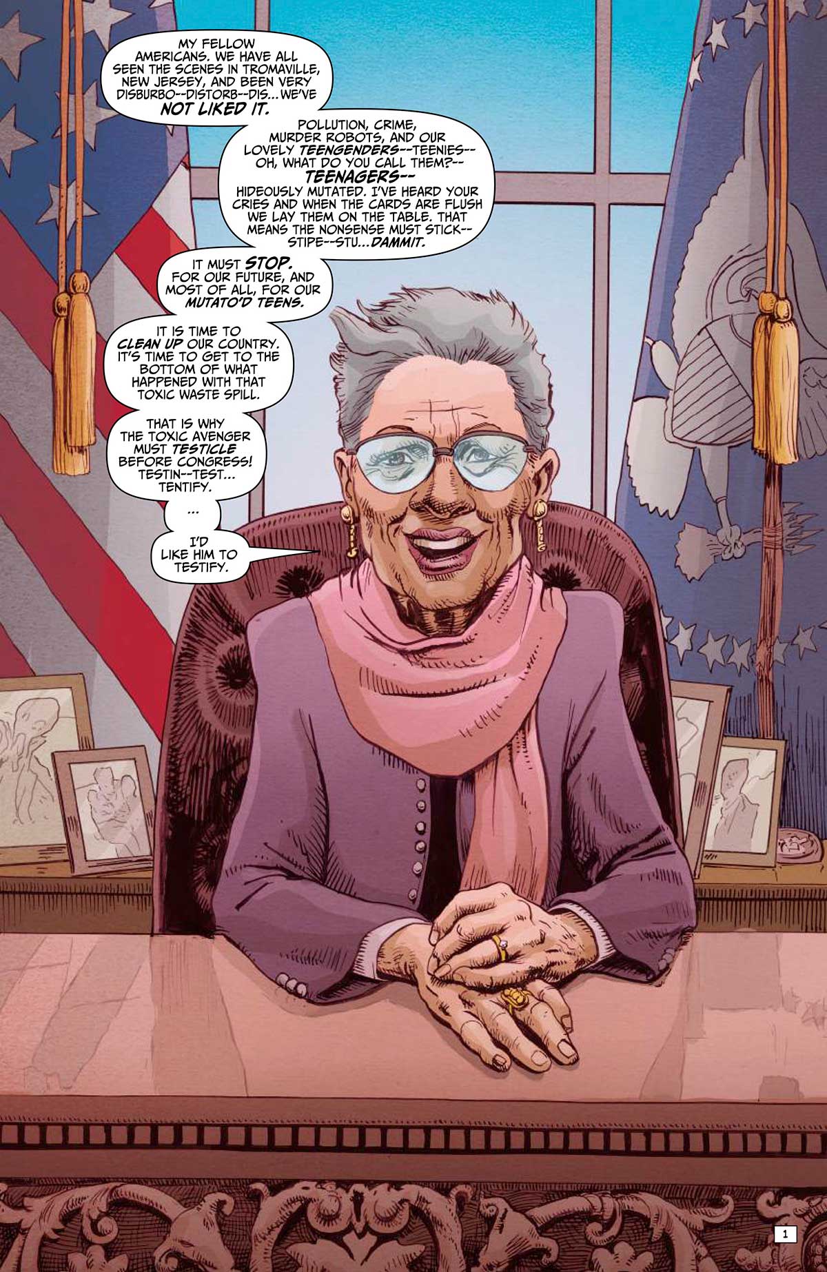 In the debut issue’s self-contained horror story, kids are disappearing from Toxie’s hometown of Tromaville, NJ. Did they simply run away from the chemically polluted town? Or is the real explanation even more frightening? Each issue of the first story arc — issues one through five — will feature the first appearance of an entirely new character and have a two-page story illustrated by Fred Harper that sets up the second story, “Toxie Goes to Washington” that starts with issue six.