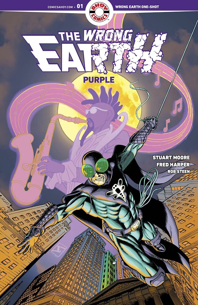 The Wrong Earth: Purple #1 from writer Stuart Moore, artist Fred Harper, and letterer Rob Steen. On sale in May, this issue introduces Earth-Kappa, a dark but glossy world of big hair, shoulder pads, Wall Street traders, rubber super-suits, and funk music.