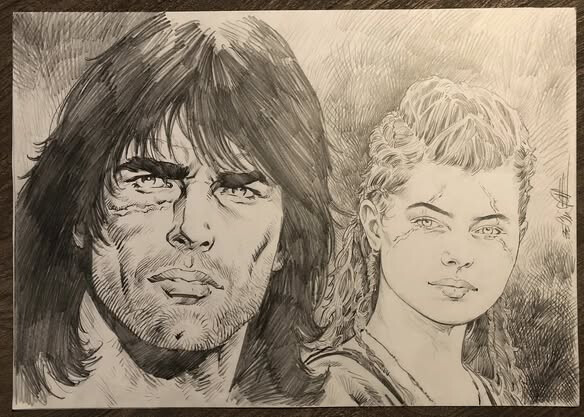 Ici un dessin au crayon format A3 de Thorgal et Huldra, la déesse d’Ambre.