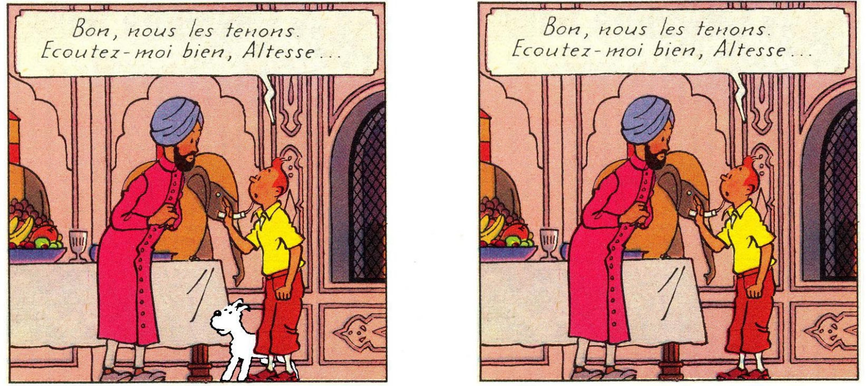 Dans le chapitre très vaste des modifications d’albums, une erreur glissée dans Les Cigares du Pharaon : pendant de longues années, Milou a écouté la conversation entre Tintin et Son Altesse. Et dans la nouvelle version, il a disparu car il ne pouvait matériellement se trouver à cet endroit, étant donné qu’il était prisonnier des Dupond-t.