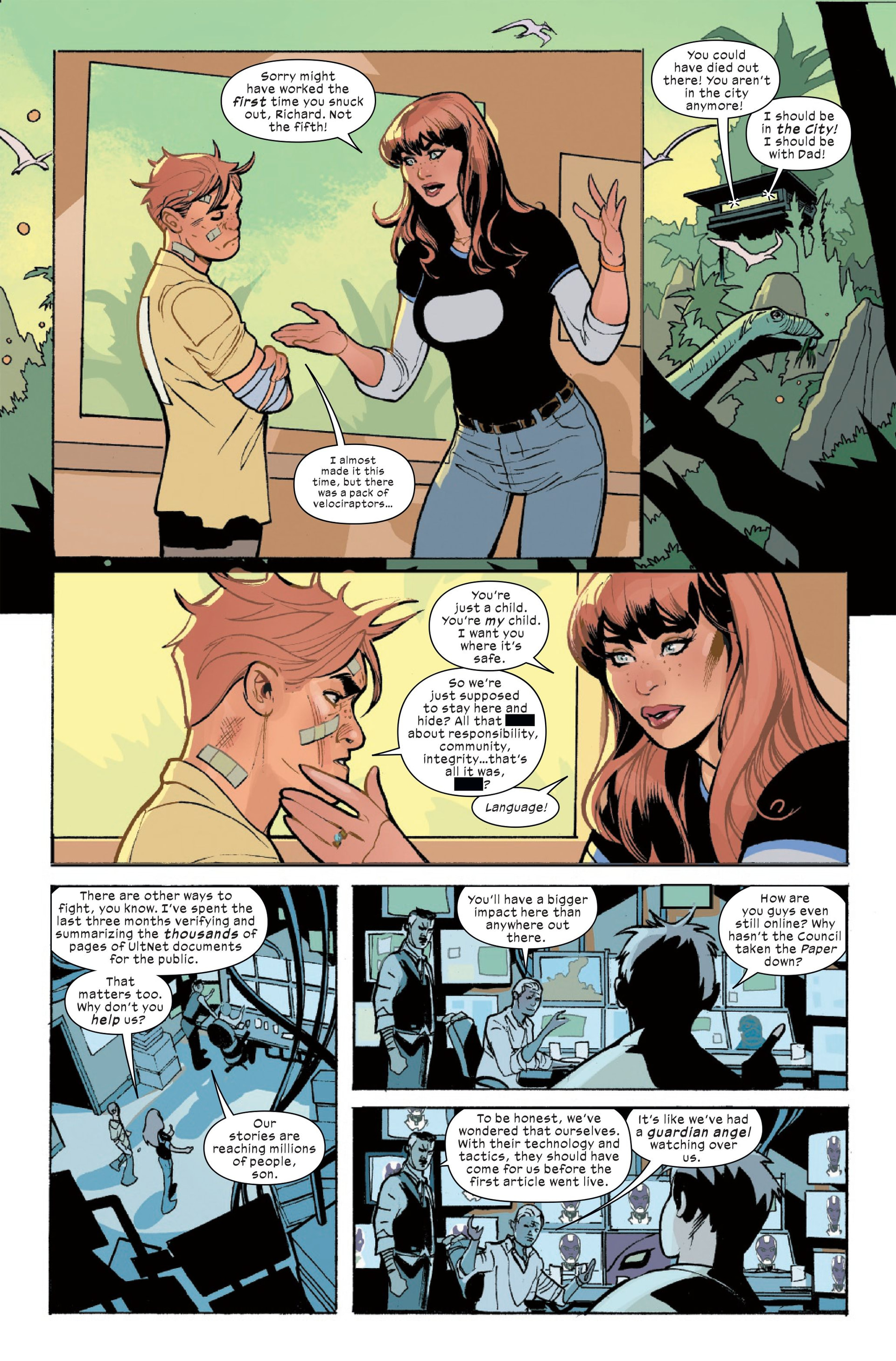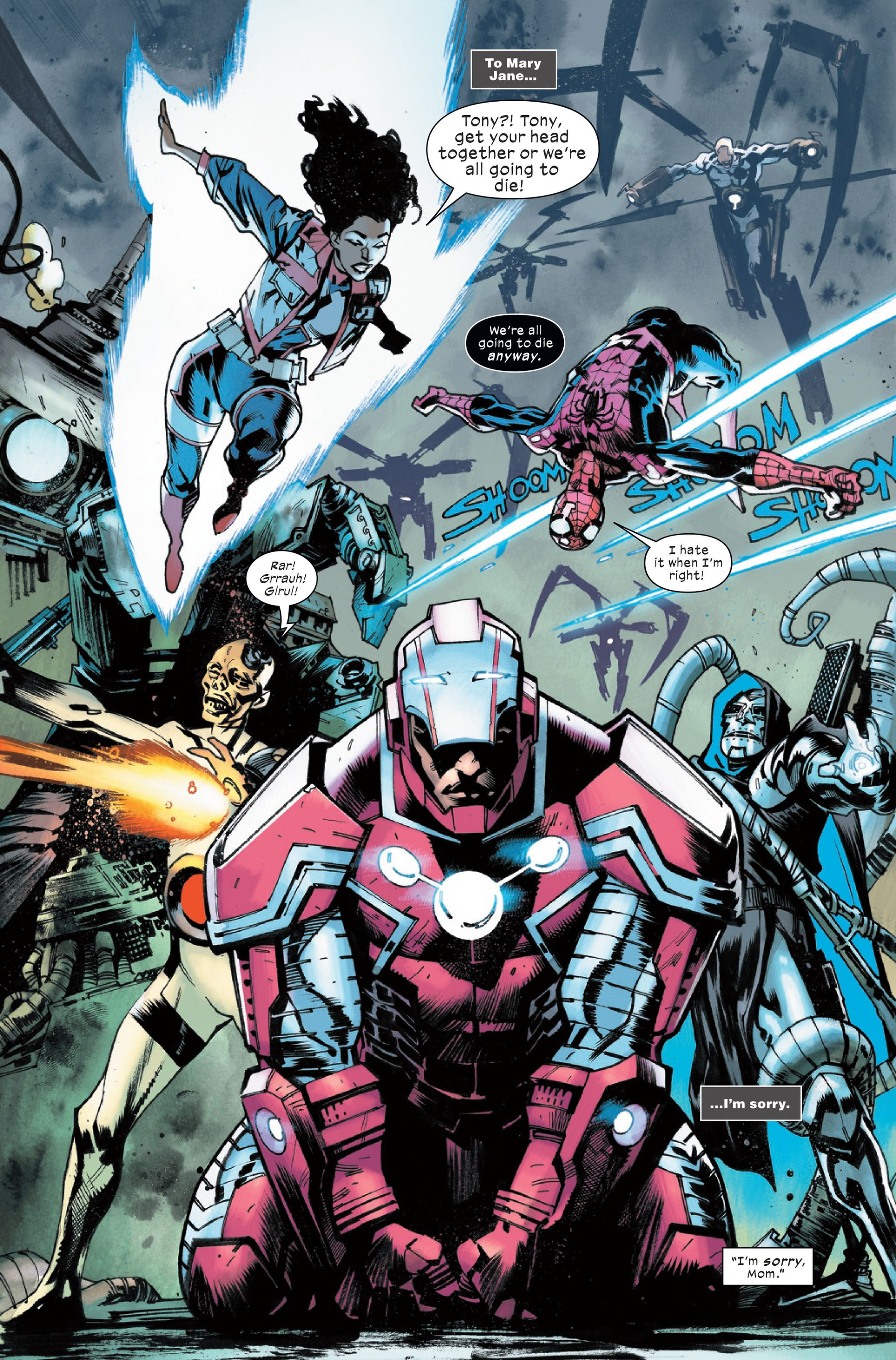Surprenant, intense et réussi. Deniz Camp avance la saga de fin de ce nouvel univers Ultimate, et j’en viens à croire en cette conclusion vu les événements sombres qui se déroulent ici. Ainsi, en dehors du dôme de The City en Latvérie, les choses accélèrent. Ben Parker & Jonah Jameson découvrent, en Terre Sauvage, que leurs articles de The Paper sont encore diffusés sur Internet grâce à Vision / Jim Hammond, qui veut leur donner des informations sur l’état du monde, alors que Mary-Jane impose à Richard de cesser de fuir pour aller aider son père, ce qu’il ne veut pas. Les X-Men de Meistorm pensent avoir vu Hisako à The City à la TV, et Nico les téléporte pour confronter des sbires de The Maker ; les jeunes sont aidées par Erik Killmonger, brutal et efficace. Dans le dôme de The City, Iron Lad est figé et semble tétanisé alors que Spider-Man / Venom (son costume I.A. qui prend le relais) / America Chavez / des Deathloks d’Immortus / Howard Stark désormais mort luttent contre la ville elle-même, qui est constituée du corps élastique de The Maker. Doom voit et entend des mots de The Maker qui le manipule, alors que le groupe est aidé par Kang, vu dans Ultimate Invasion. Il se révèle être un Tony Stark venu de milliards d’années dans le futur, et il a pris ce nom Kang car cela veut dire « conquérant » dans l’une des premières langues de l’Univers. Il dit avoir déjà vécu ça et évoque les morts à venir des héros, qui paniquent, et The Maker conseille à Doom de tuer Kang pour récupérer une deuxième machine temporelle, mais Doom se loupe (vraiment ?) et détruit la machine temporelle. Kang s’évapore, « comme prévu », et The Maker explose. Des gouttes de lui tombent sur le costume I.A. de Spider-Man, et il en prend le contrôle pour devenir rouge, noir et blanc. The Maker dans le costume I.A. se moque des rêves de grandeur de Peter et il le tue (!), en faisant « un beau carnage ». Et, chez elle, M-J pleure sans raison soudain…