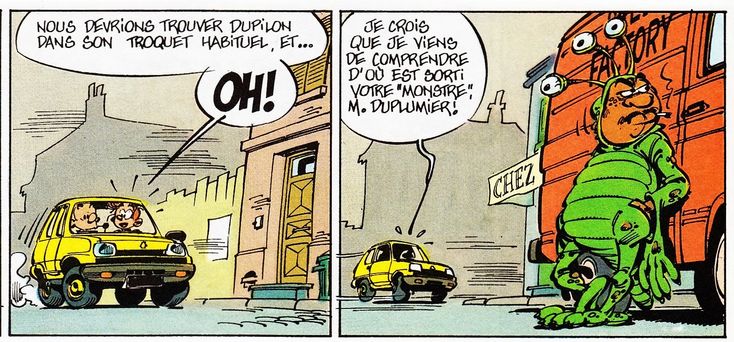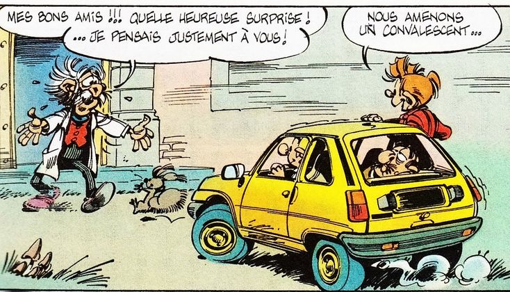 On voit bien que Fantasio conduit une Renault 5 jaune (là où, de mémoire, elle était rouge chez Fournier).