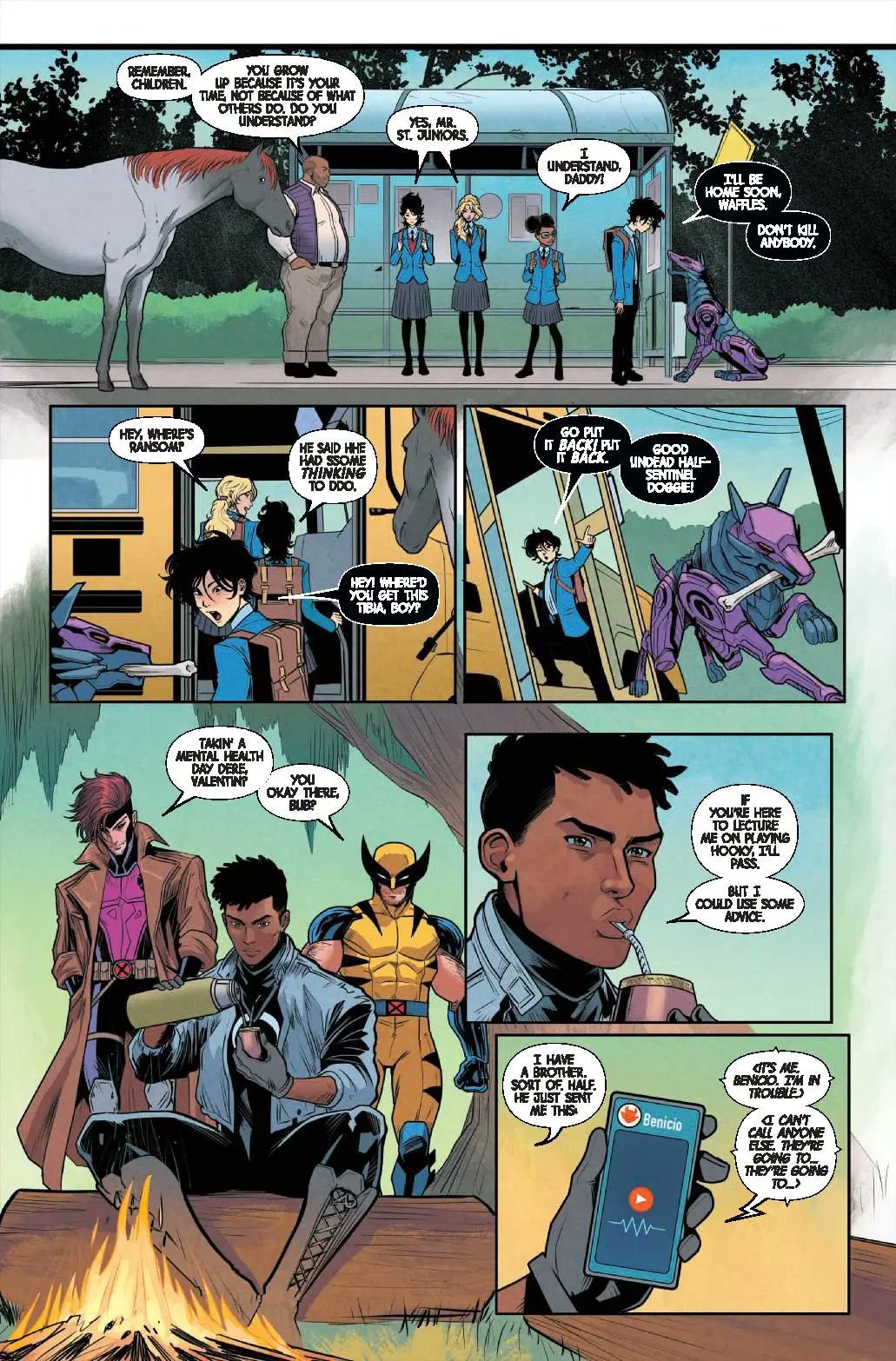 Sympathique et pertinent pour creuser Ransom, le meneur des jeunes Mutants couvés par les X-Men. Gail Simone fait un petit point sur ses personnages, montre Rogue qui propose à la jeune fille bègue de se faire soigner sans l’imposer (par respect), alors que Ransom reçoit un message de son frère qui l’appelle à l’aide, pour le sortir d’une secte masculiniste violente et anti-mutante. Mais Ransom est perdu, car sa famille l’a rejeté et l’a même laissé à des kidnappeurs quand sa Mutanité a été révélée. Il accepte finalement l’offre de Wolverine d’y aller, pour bien faire, et ils tabassent des sales types, mais sont interpellés par leur chef - qui est le père de Ransom.