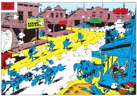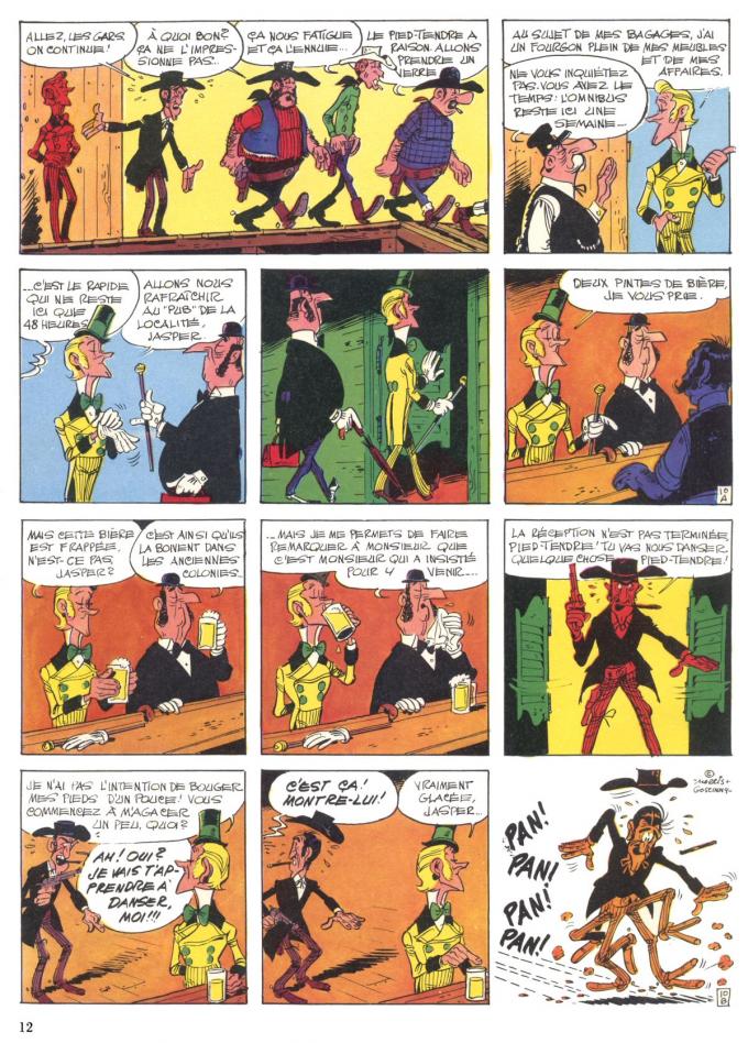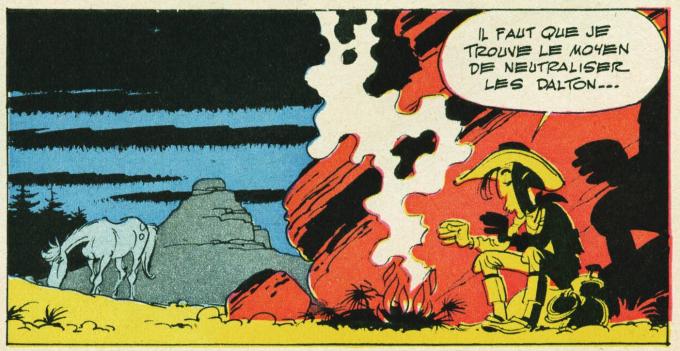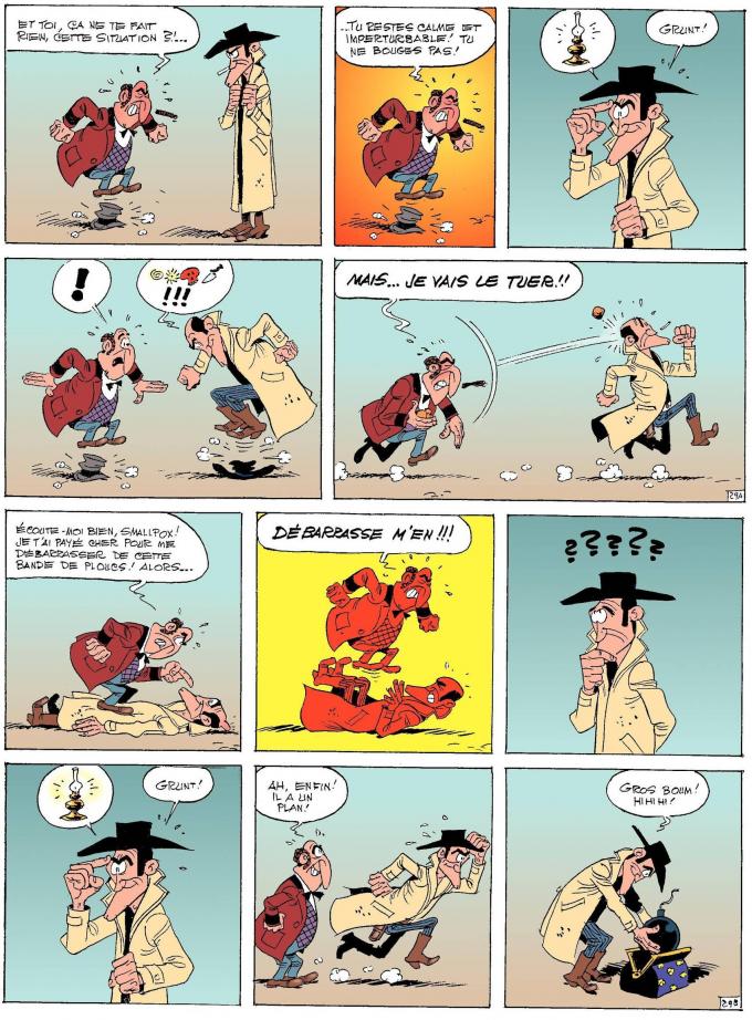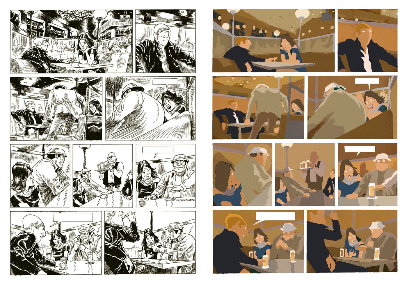 Une autre de Blutch, extraite de Lune l’envers avec un personnage de Lantz qui n’était pas encore Blutch lui-même, et une version couleur un peu plus pop. Au début d’un livre je mets toujours beaucoup de couleur, ça clignote dans tous les sens, jusqu’au moment où je réalise que l’histoire n’a pas besoin de telles ruptures, contrastes, etc. Alors je reviens à un accompagnement plus en lien avec ce qui se raconte et j’oublie mon goût du jeu purement visuel. Il en faut, bien entendu, mais pas à tout bout de champ et surtout pas n’importe quand ! Quand on vous dit que c’est un métier
