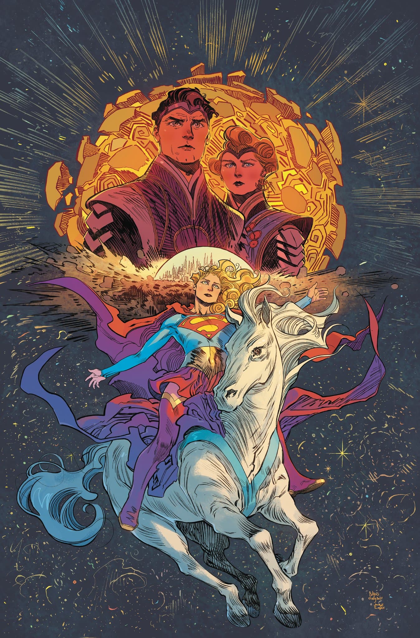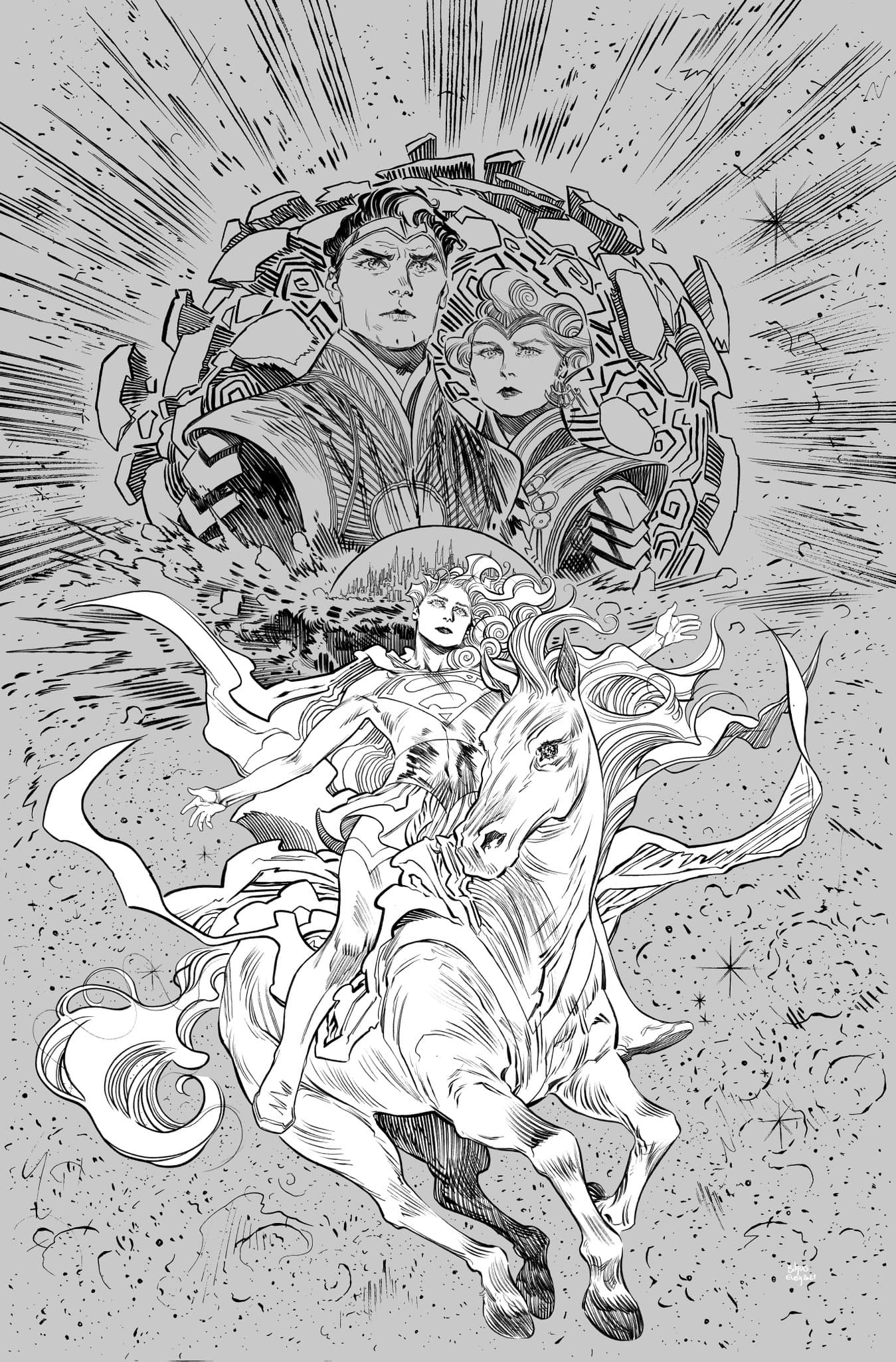 Couverture de Superman : The kryptonite spectrum par Juan Ferreyra #2 à différentes étapes de la mise en couleurs, avec les variations sur l’intensité lumineuse émanant de la pierre et comment cela dicte les ombres placées sur Superman: