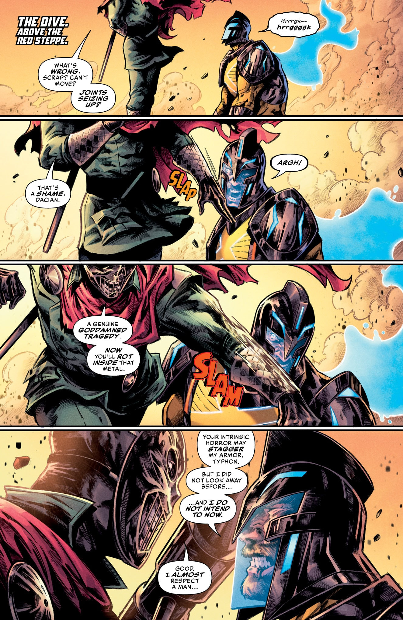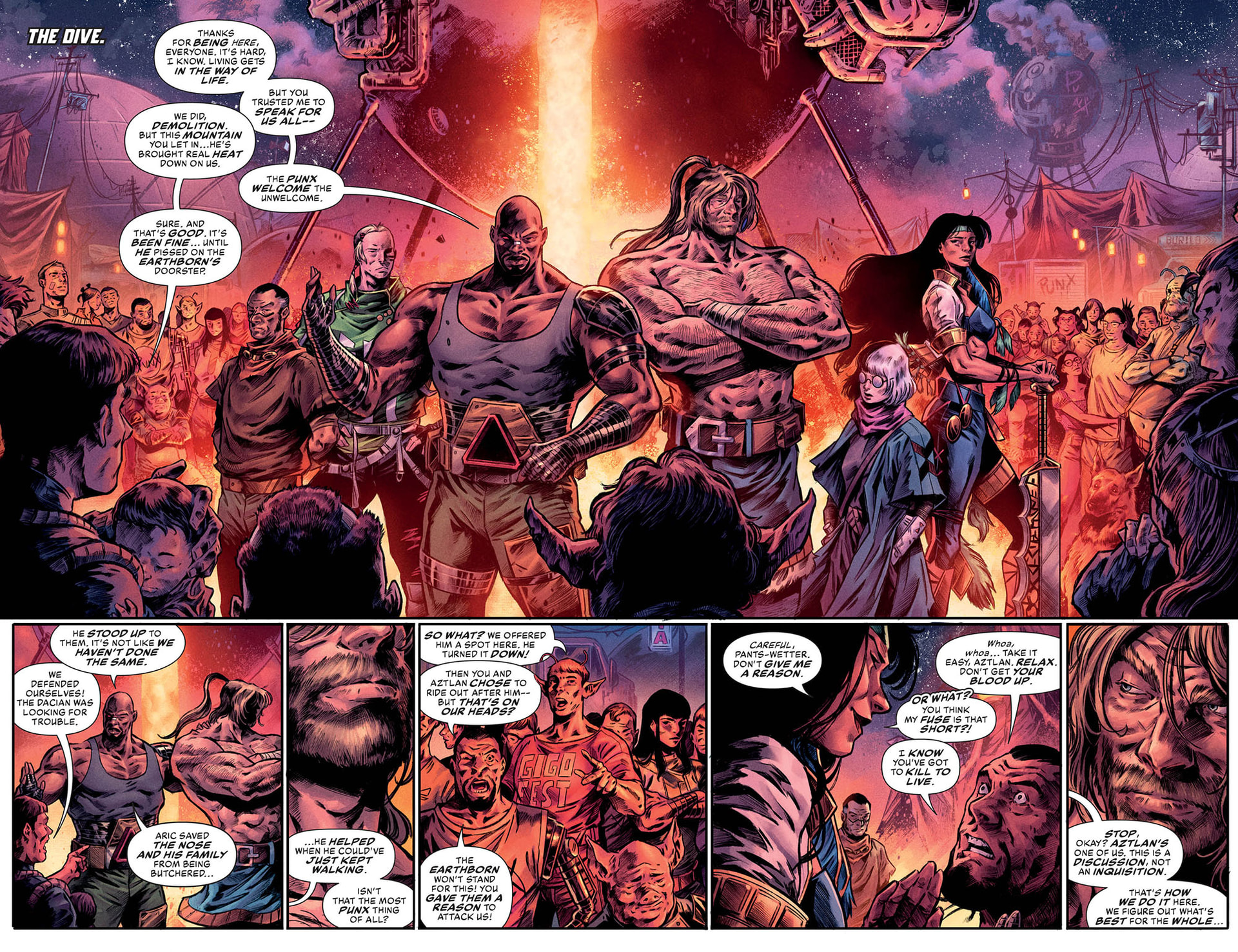 It’s hide or fight for the PunX of the Dive when the Earthborn attack, and the leader is set on killing Aric for daring to confront him. The cosmic being inside Aric’s armor, Shanhara, is paralyzed after Typhon’s horrific field vision, with the extent of the damage unknown!