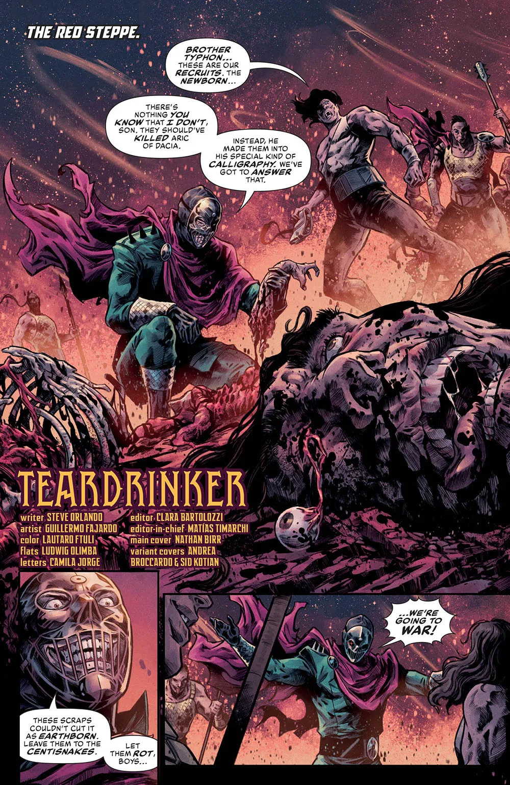 « Aric of Dacia walks the Red Steppe, the wasteland that sizzles and steams beyond the great utopias of the world, » Orlando continued. « There, his quest is both bloody and ever out of reach – the quest to reclaim his honor after centuries in the cosmic arena. Ever the deadly stranger, Aric’s only allegiance is to his quest, and there’s no shortage of monsters standing in his way. Spit up deep from a gash in the dirt are the Earthborn, humans reborn in toxic soil as mad berserkers and the supposed chosen rulers of the Steppe. But these mad men have never met the Man of War. »