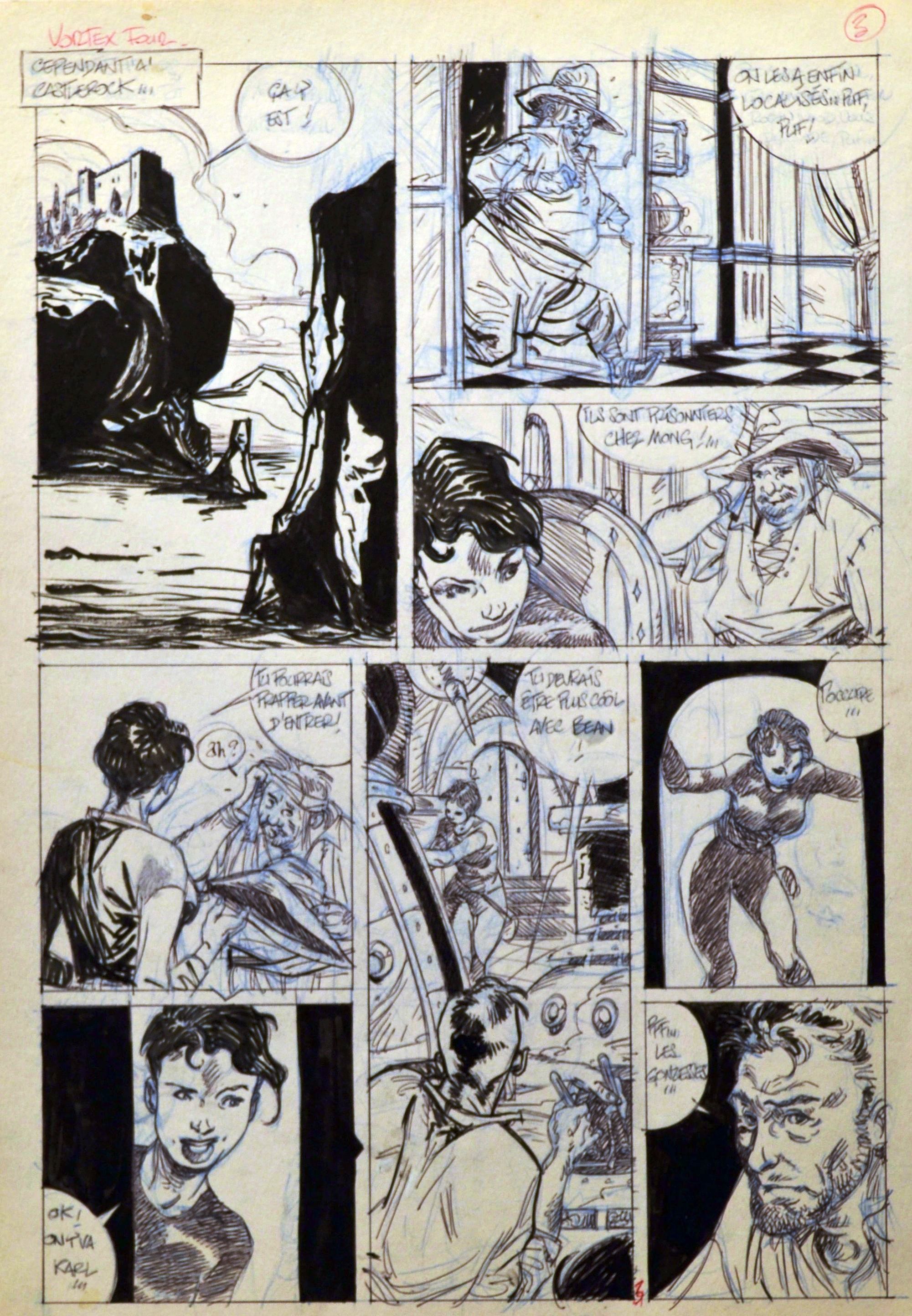 Il s’agit de Nicolas Moraës, un dessinateur qui n’aura fait que quelques incursions dans le monde de la bande dessinée (les deux albums de Sidney & Howell cités plus haut ainsi que, plus récemment, une histoire courte dans un numéro de Doggy Bags chez Ankama, sous le pseudonyme de Kartinka) avant de retourner dans l’univers de la photographie de mode. Je lui ai demandé des précisions, et voici ce qu’il m’a répondu : « Oui, c’était un essai libre pour Vortex, au bic direct et pinceau. Tout l’encrage est de moi… »