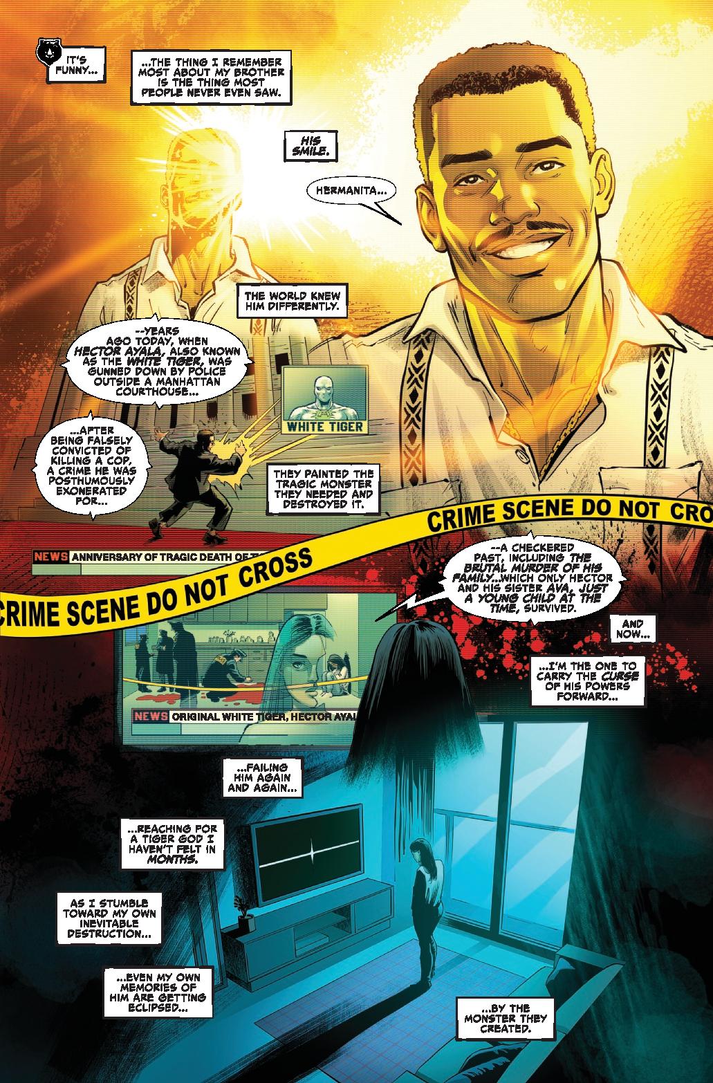 Ava Ayala is the current wielder of the powers of the White Tiger, bearing the amulet of power that imbue its host with a connection to mystical power and martial arts prowess. As Ava returns to her old stomping grounds to protect the innocent, she becomes embroiled in a mystery that forces her to confront her family’s murder and history linking them to the White Tiger mantle as Ava is brought face-to-face with – Hector Ayala, her dead brother and the original White Tiger?!