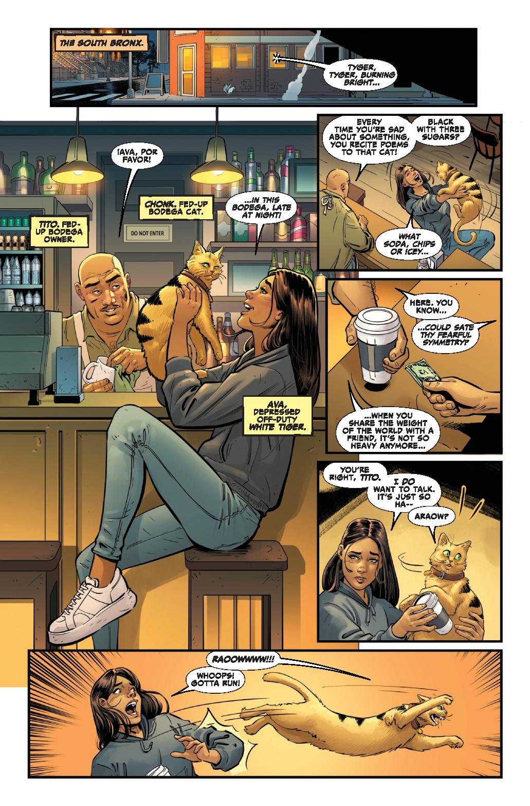 Daniel José Older débute avec le coeur du numéro, où Ava Ayala se sent oppressée par son lien difficile avec le Tiger God et les souvenirs complexes de son frère Hector, dont elle se rappelle souriant alors qu’il était essentiellement un héros dur et direct. Elle sauve une vieille femme d’un sale type, et c’est une voyante qui évoque son trouble intérieur avec le Tiger God. Cela convoque l’esprit d’Hector, qui possède la voyante et lui dit de l’aide pour revenir sur les raisons de sa mort. Ava « récupère » la possession, sollicite un détective privé qui a bossé sur l’affaire, et ils remuent l’enquête mais ne trouvent rien. Cela ronge Ava, qui boue de désespoir - et D’Spayre se révèle, car il s’est fait passer pour le spectre d’Hector pour se nourrir du désespoir autour de la disparition d’Hector. Mais Ava se souvient de son sourire, de sa joie, et le vrai fantôme de son frère l’appelle, et la met en contact avec le Tiger God, crispé non pas avec elle mais ce monde qui ne lui plaît pas, d’où les pulsions violentes et les allers-retours de super-pouvoirs pour elle ou Angela, sa nièce (plus âgée). Ava fait la paix avec le Tiger God et tabasse D’Spayre, puis décide d’aller de l’avant et d’assumer l’héritage familial positivement.