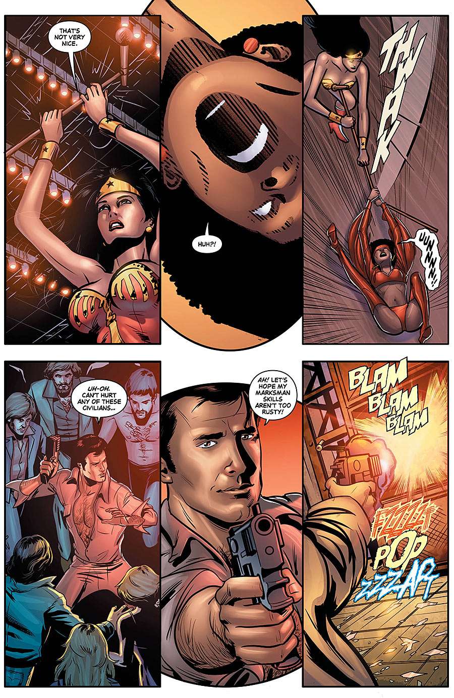 La première, purement dans l’ère seventies, avec pour titre Disco Inferno, y voit Diana Prince/WW et Steve Trevor s’occuper de la protection de scientifiques Russes désireux de quitter leur mère patrie. L’un d’eux déjà sur le sol américain leur donne du fil à retordre car peu soucieux de se faire protéger. Un bonne partie du récit se passe dans une discothèque.