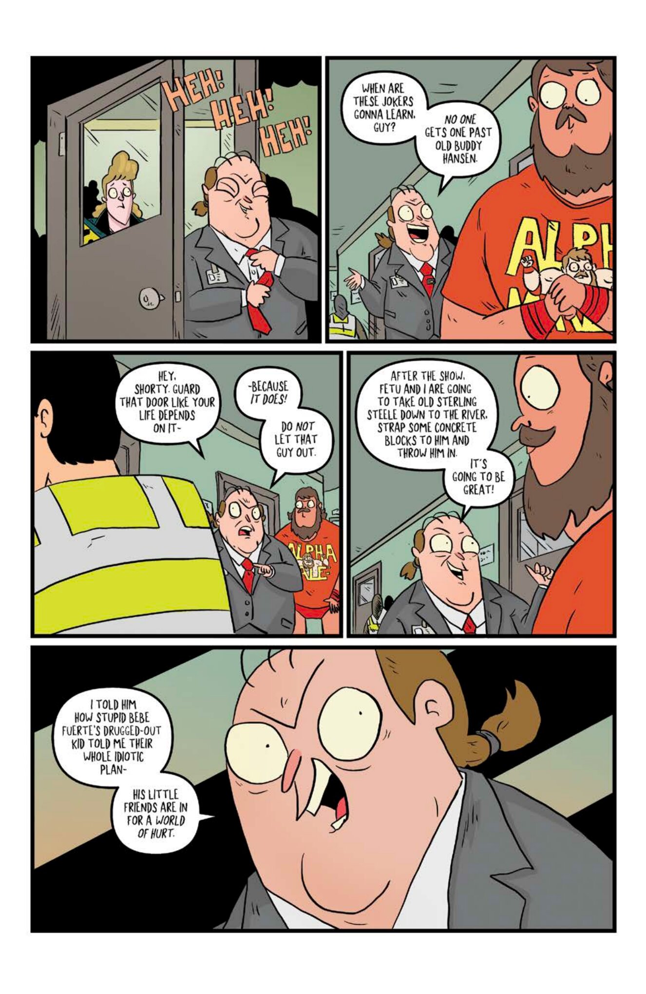 If our heroes survive the trap set for them by crooked promoter Buddy Hansen and if they can survive each other they turn their attention to the greatest heist in Wrestling History! Is there team complete? Are they prepared? Will there be a training montage? You better believe there will be! Does this issue curiously make this series an evergreen Thanksgiving season classic? Curiously it does, indeed!