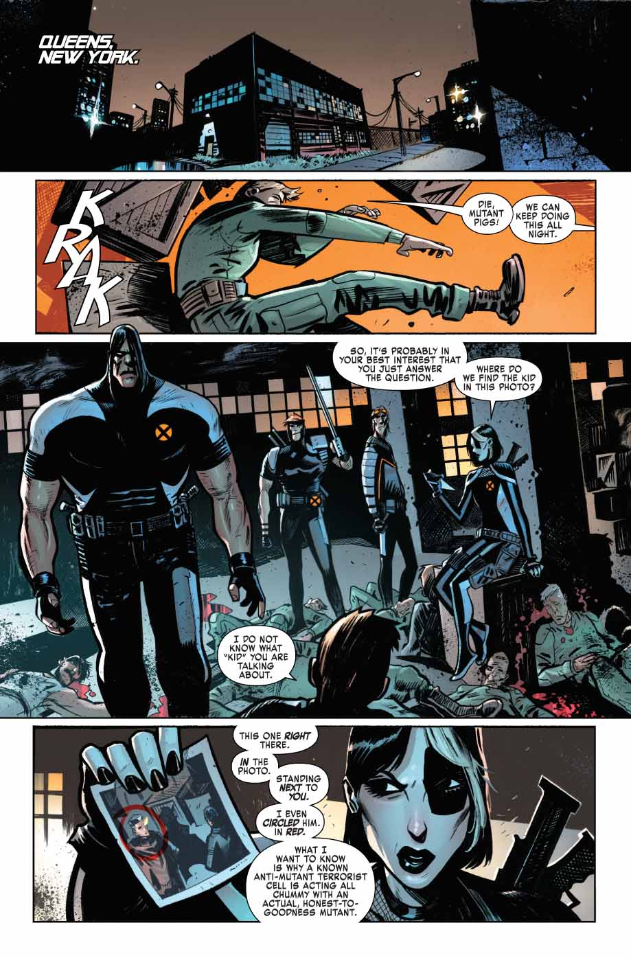 Là, dans ce #2, il va plus loin et plus fort qu’après les débuts, et ça fonctionne très bien. On plonge plus profondément dans le fonctionnement de ce pays fictif de l’Est, avec un président abominable qui a cependant de « bons » dialogues (sa certitude sur l’infection mutante est un bel exemple de fake news, sa réflexion sur l’anglais est bien vue), et une ambiance générale oppressante qui est très bien vue. On revoit Ahab, ce qui n’est pas une mauvaise chose vu la fin d’Extermination (l’histoire continue, c’est plutôt bien), on a un indice sur un mystérieux « lord » qui voulait un paradis pour les mutants (X-Man ?), mais surtout on a la suite de la confrontation entre X-Force et Cable… les premiers se sentant obligés d’aider le second, à cause de la situation locale.